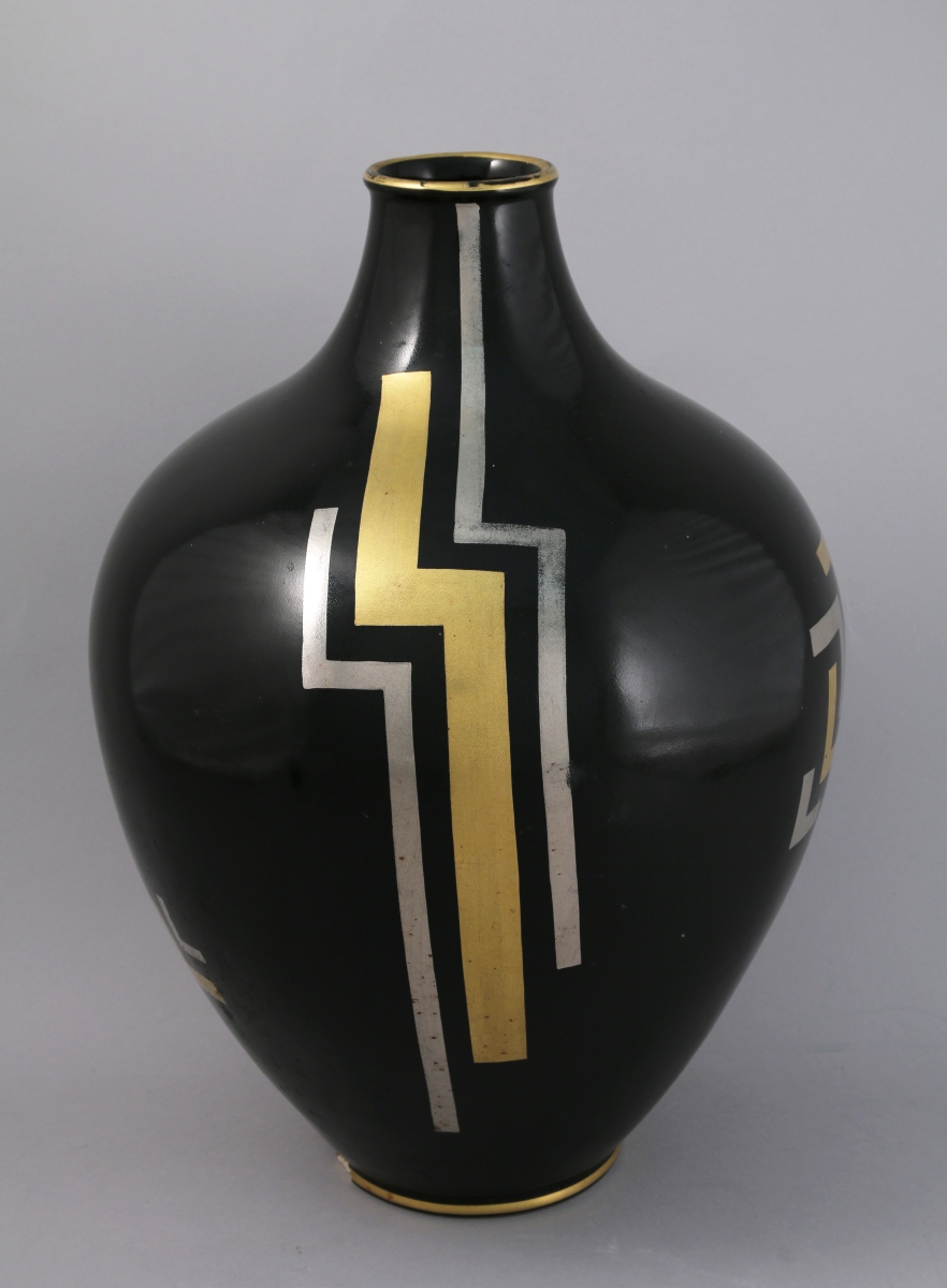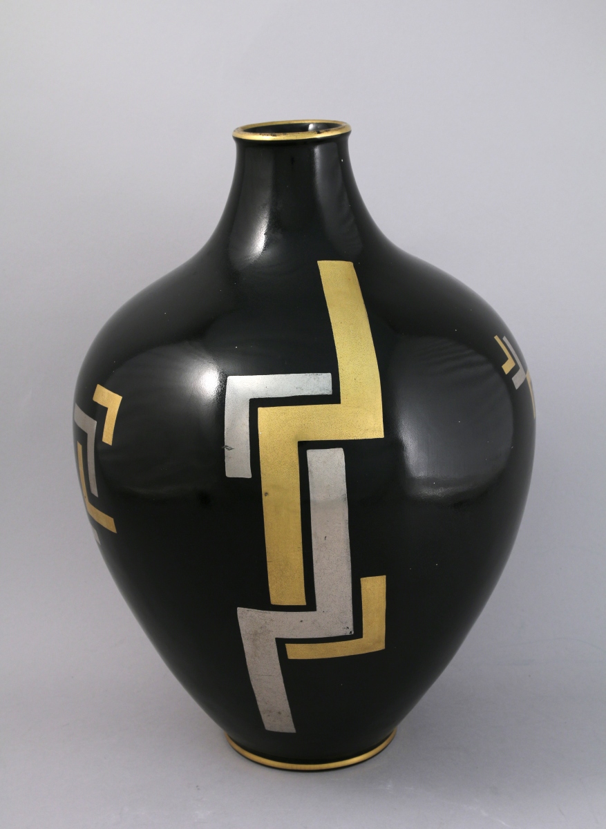 VASE balustre à corps pansu et petit col, en faïence noir, le décor géométrique or et argent à l'imitation de la dinanderie. Marque au revers "Made in France"