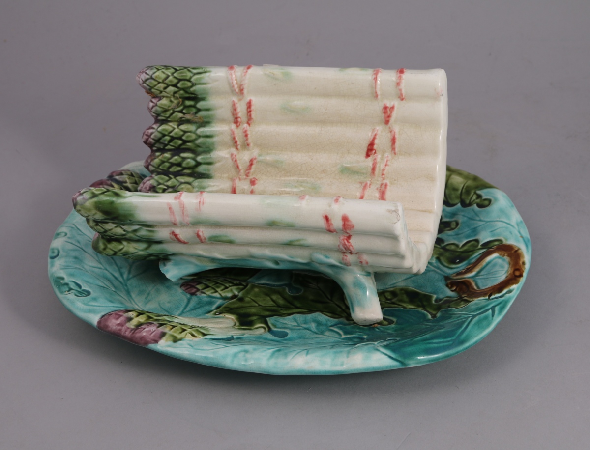 NIMY. MOUZIN LECAT & CIE. PLAT à ASPERGES et son PLATEAU en faïence polychrome. Décor en trompe-l'oeil d'asperges et de feuilles. Marque au revers.