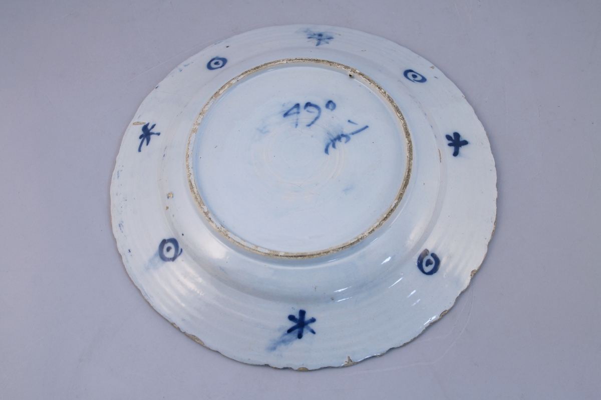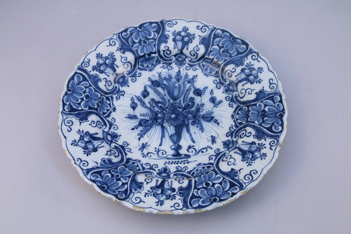 DELFT. Plat circulaire à bord ondé, à décor de bouquets fleuris en camaïeu de bleu.