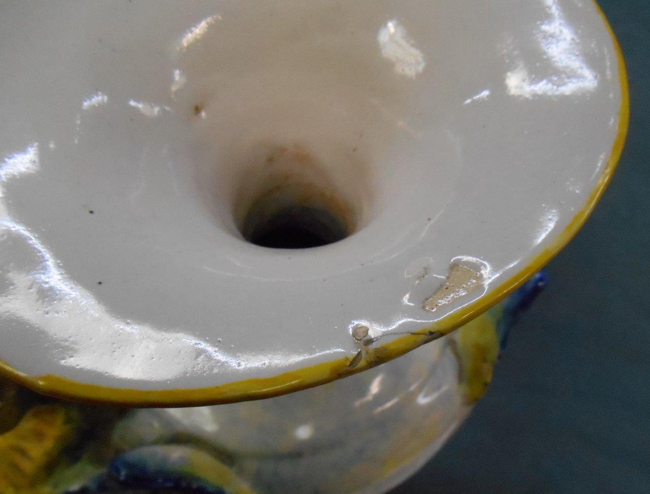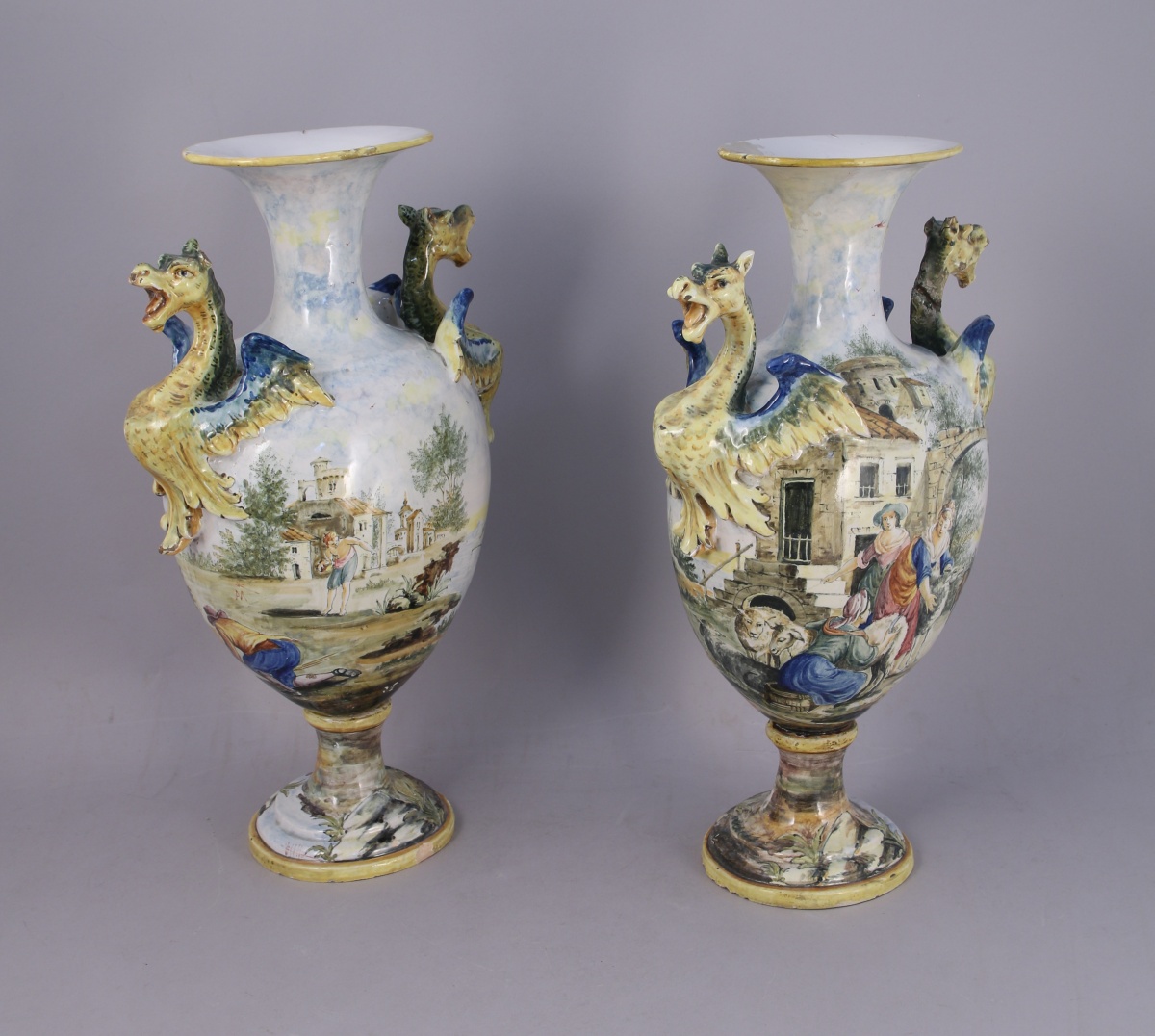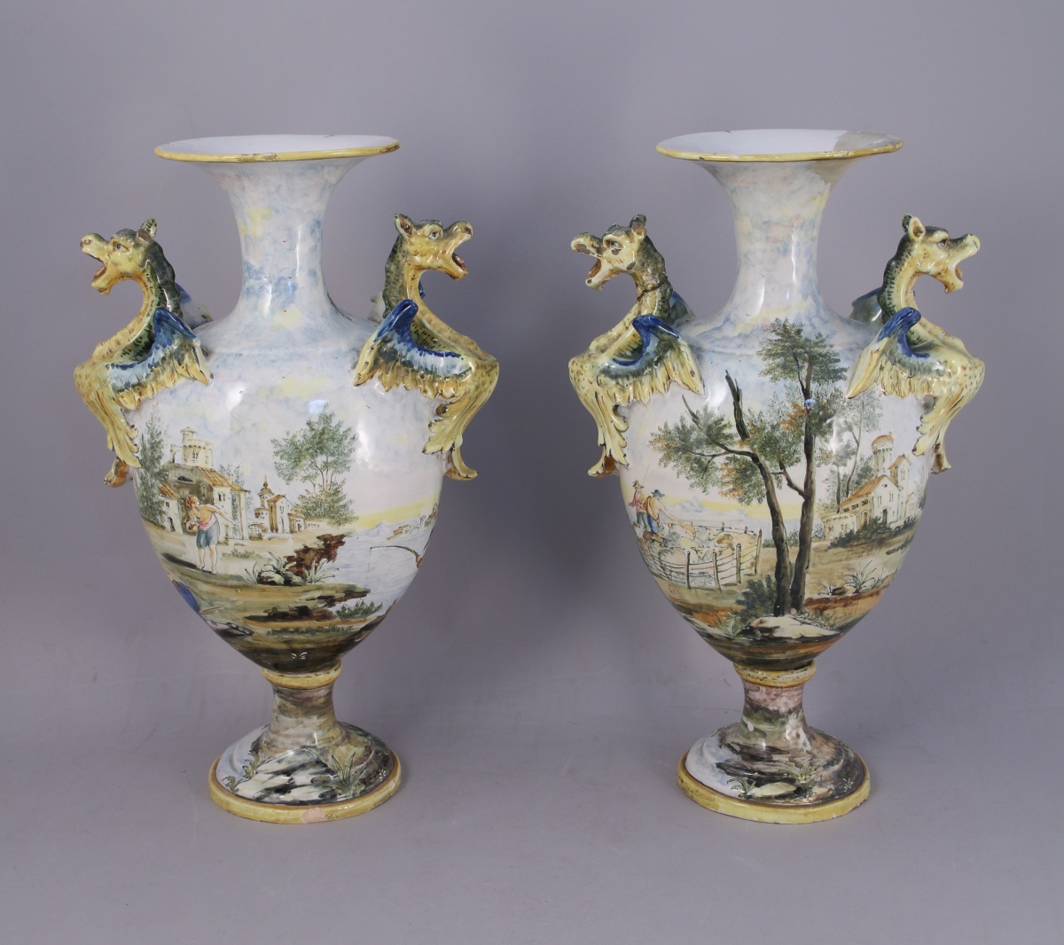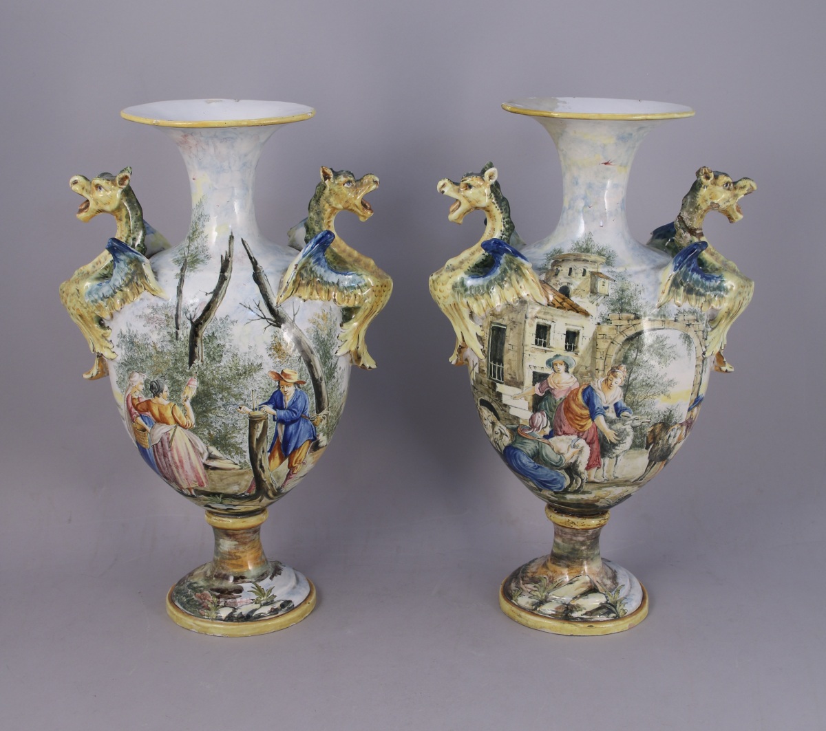 PAIRE de VASES sur piédouche en faïence polychrome, paire de chimères sur les côtés. Scènes rustiques de pêche et de tonte de moutons.