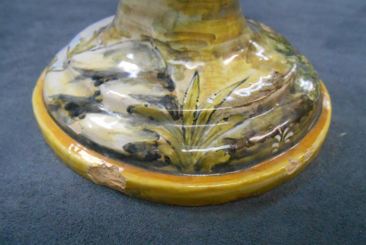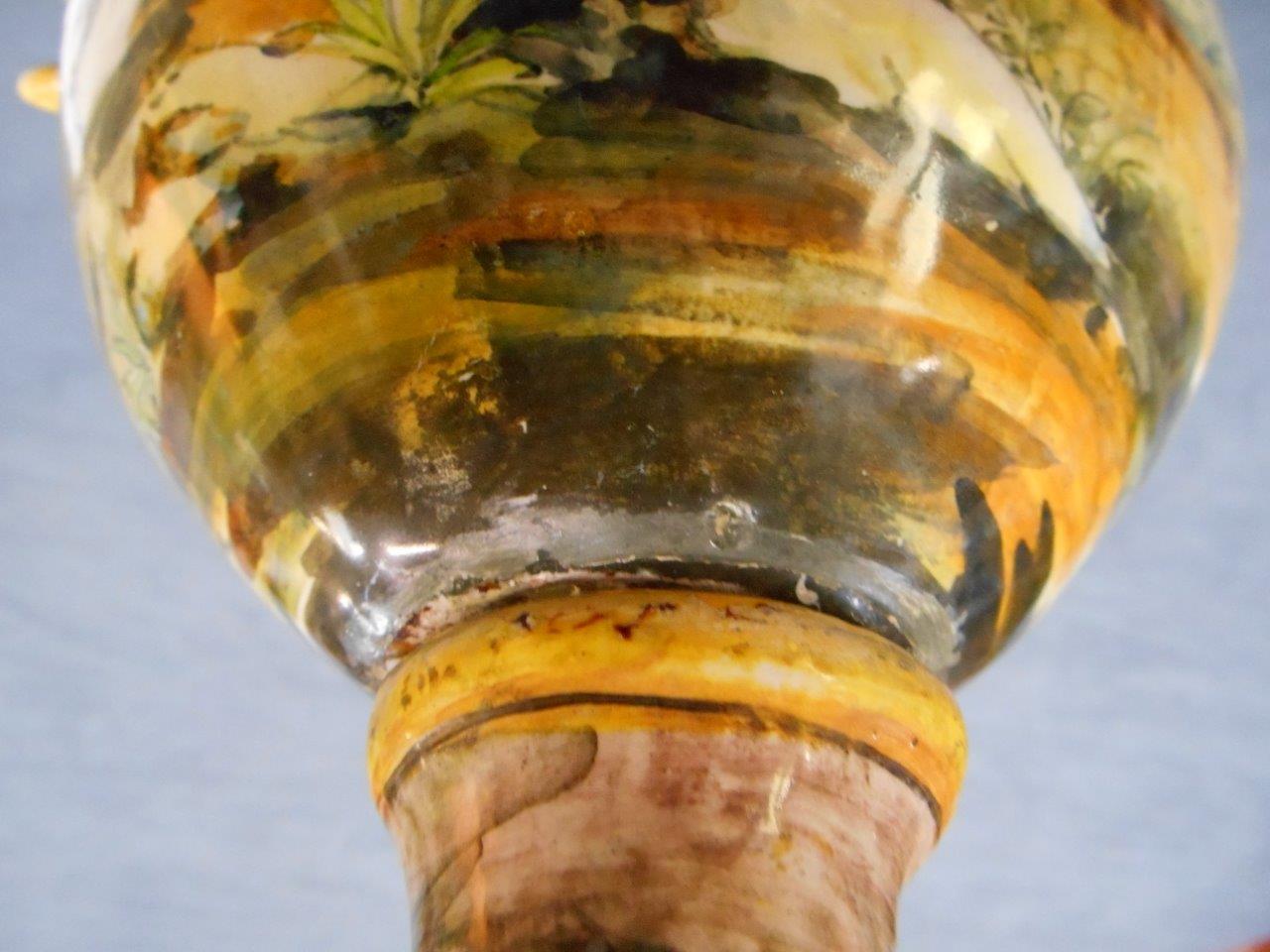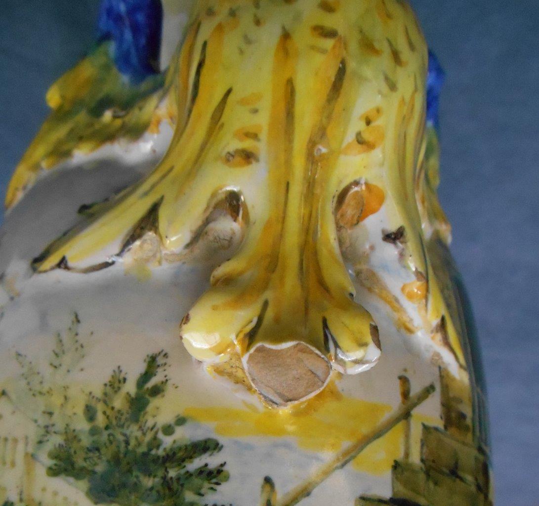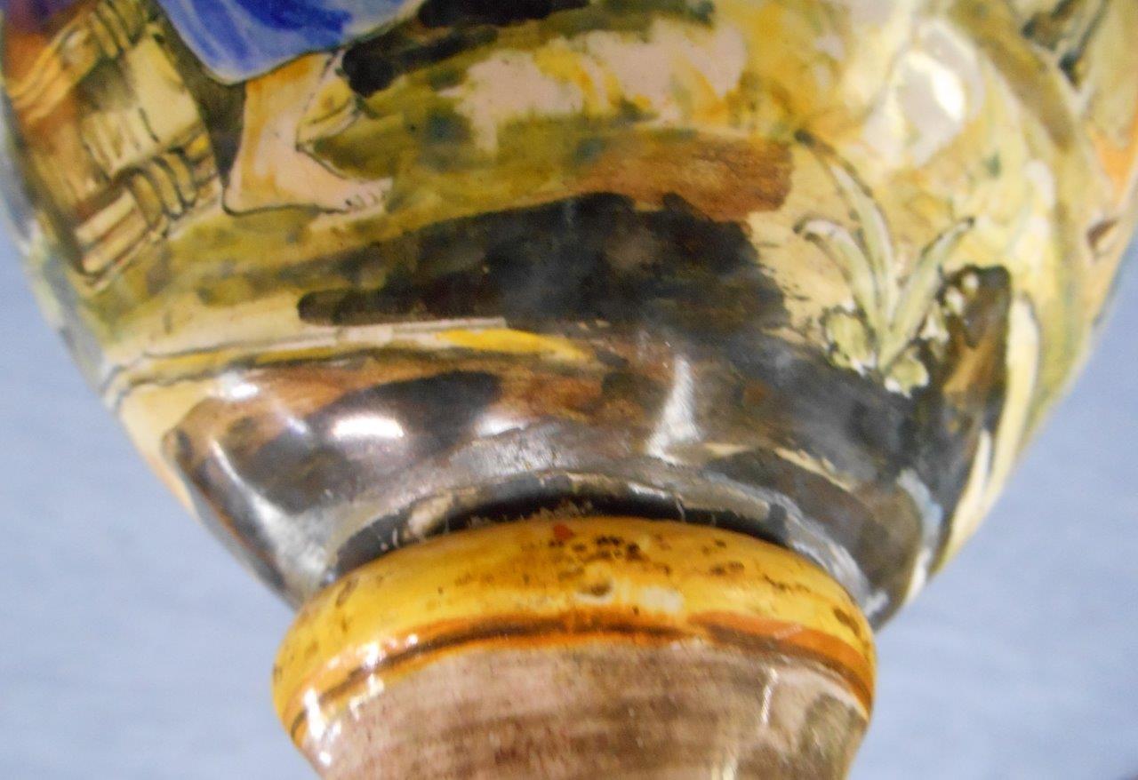 PAIRE de VASES sur piédouche en faïence polychrome, paire de chimères sur les côtés. Scènes rustiques de pêche et de tonte de moutons.