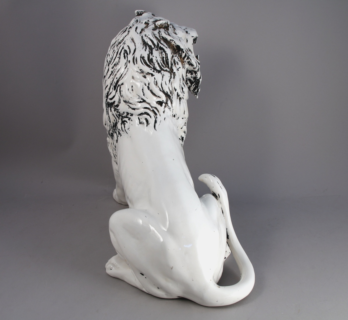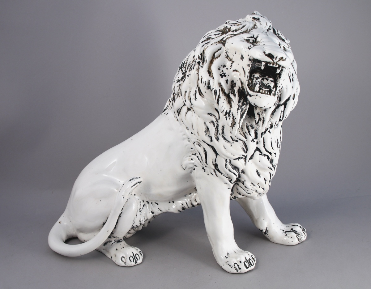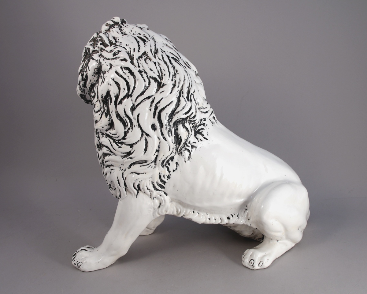 LION RUGISSANT en faïence vernissée blanche. Signature olographe et cachet d'une manufacture européenne au dessous. XIX-XXe.