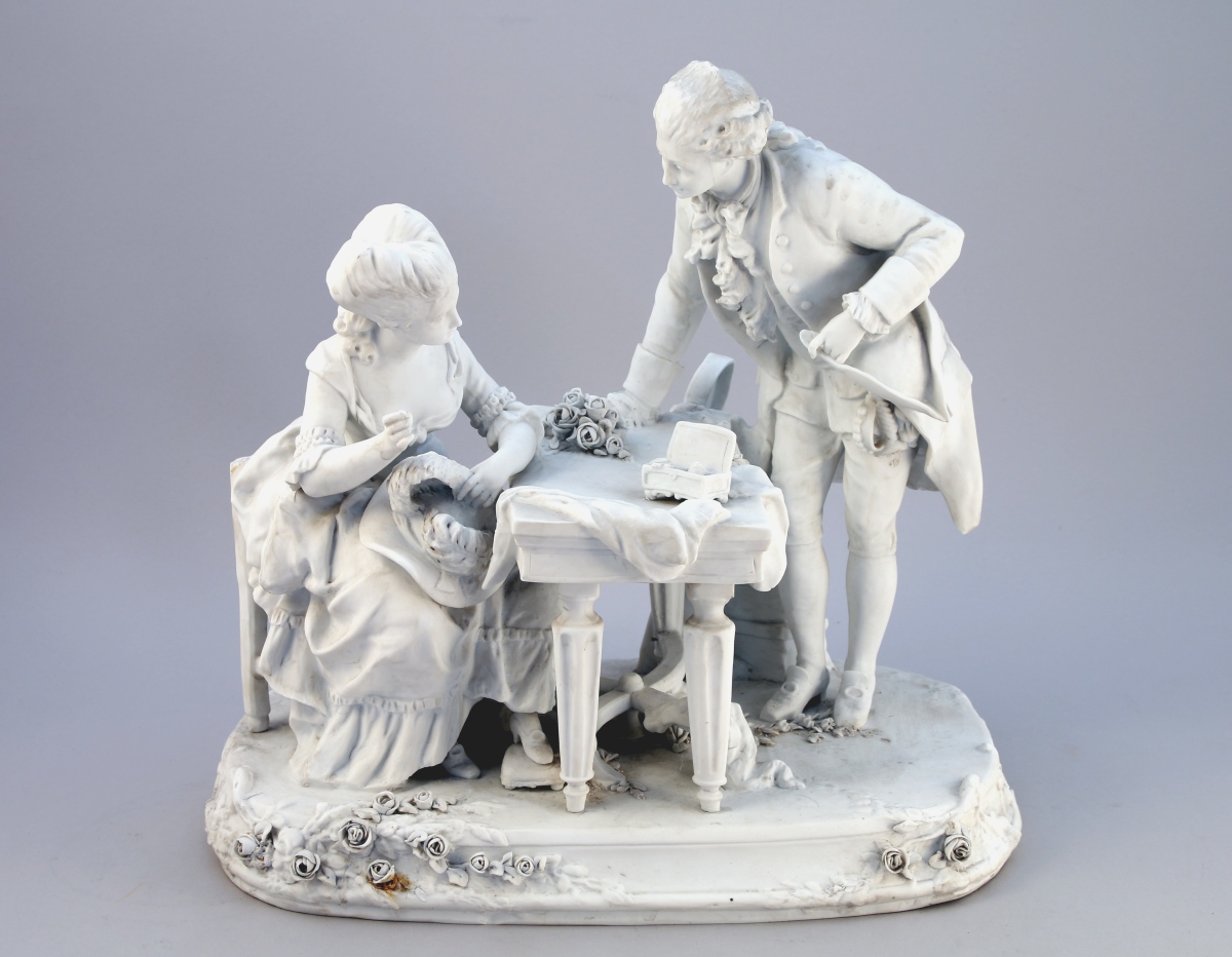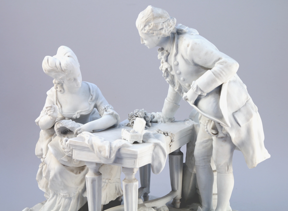 Groupe en BISCUIT figurant une scène galante avec un gentilhomme, vêtu à la mode du règne de Louis XV, offrant un bouquet de roses à une dame occupée à recoudre son chapeau. Une table de style Louis XVI sépare les deux personnages, sur laquelle se trouve une boite à couture et des tissus. Marque en creux au deux L entrelacés comme pour imiter Sèvres sous la pièce.