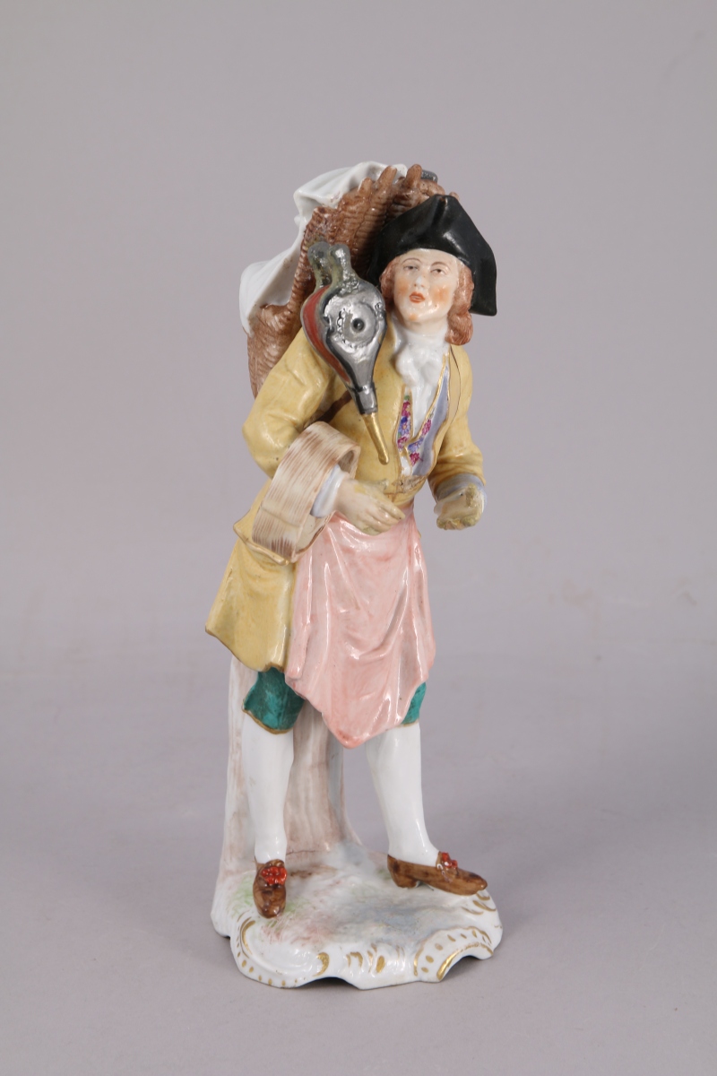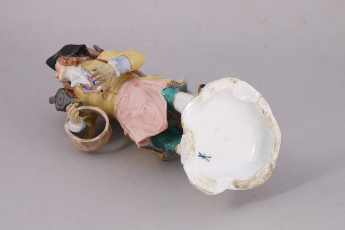 SAMSON, dans le goût de Meissen. SUJET en PORCELAINE, vendeur ambulant de soufflet, en habit de gentilhomme et coiffé d'un tricorne, un panier rempli de soufflets sur le dos. Socle à ornements rocailles. Rehauts d'or. Marque aux épées dans la glaçure sous la pièce.