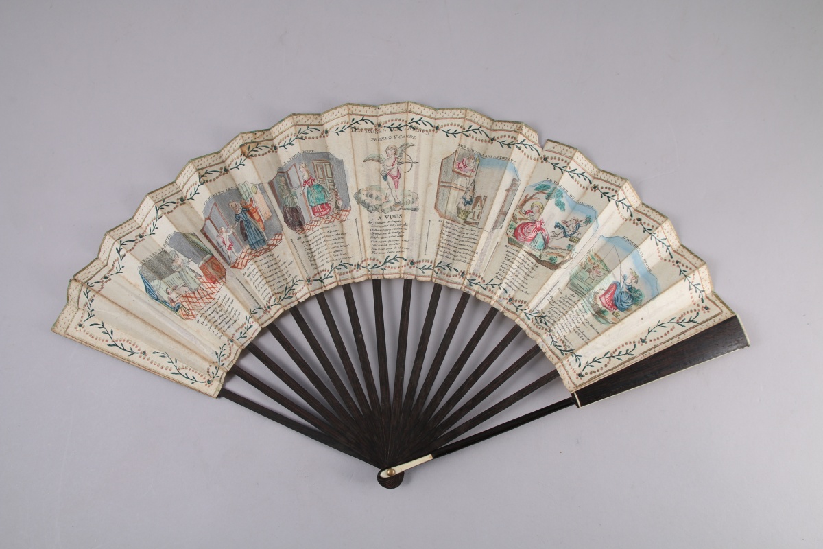 ÉVENTAIL en bois exotique et filets de bois clair la feuille ornée de scènes "les ruses de l'Amour", papier de 7 vignettes illustrées, lithographie rehaussée au pochoir.