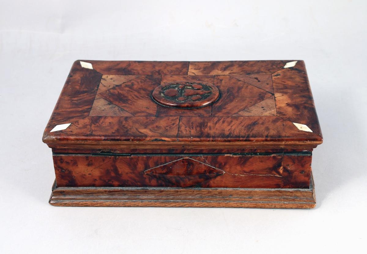 BOÎTE en placage géométrique de ronce et marquetterie d'os de forme rectangulaire ouvrant par un abattant réhaussé d'un cartouche orné d'une graine stylisée. Losange en cabochon sur mes côtés.