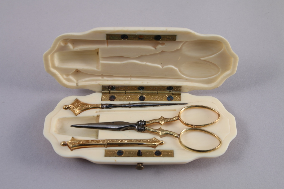 NÉCESSAIRE À COUTURE en or et acier composé d'une paire de ciseaux, d'un poinçon et d'un étui à aiguilles (enfoncements) à décor de rinceaux. Étui en ivoire (elephantidae SPP) de forme oblongue à bords chantournés monogrammé "JA" et signé "TAHAN rue de la Paix".