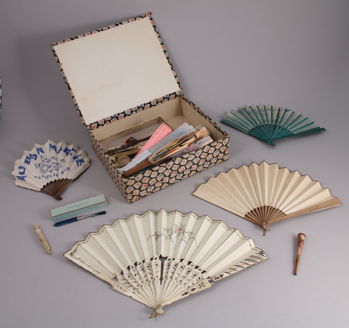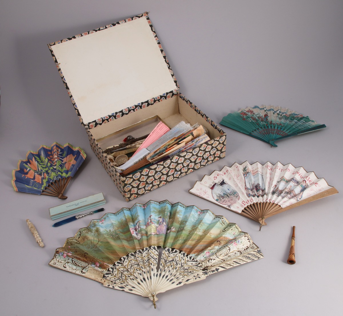 - Réunion de 19 ÉVENTAILS dont un "Souvenir de l'Exposition Universelle" de 1900, un en corne ajourée, neuf du Bon Marché et un en os peint d'un scène bucolique du XIXe.