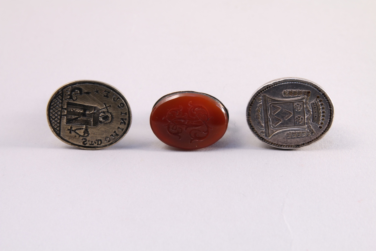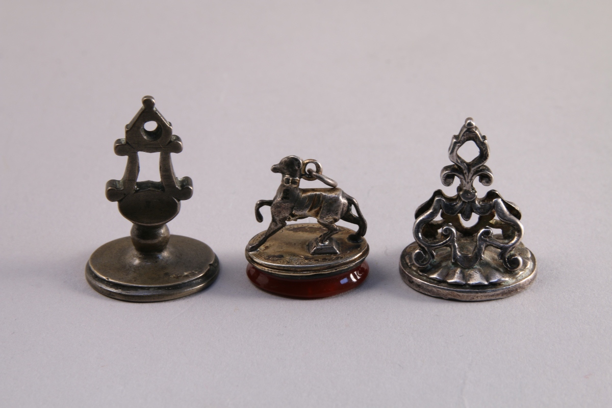 - Le deuxième en argent et vermeil figure un lévrier levant la patte antérieure droite. Anneau de bélière. Matrice en cornaline gravée du monogramme "JL". Époque XIXe.