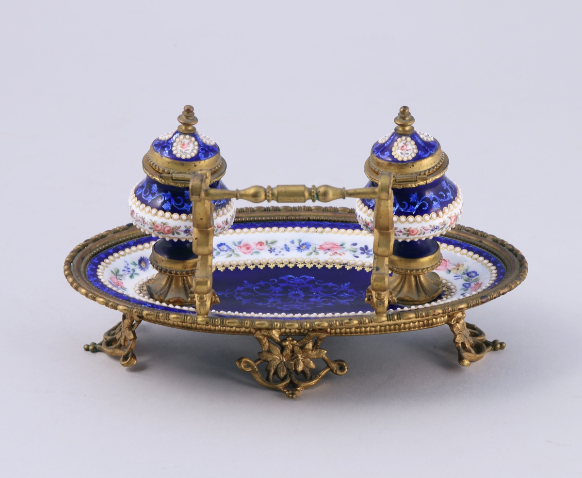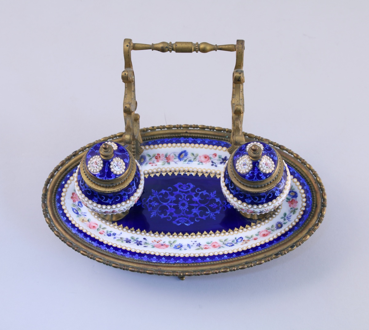 Ses deux godets à encre au couvercle retenu par une charnière sont en forme de coupe balustre et reposent sur un plateau ovoïde soutenus par quatre pieds en bronze doré à décor d'entrelacs et de feuilles de chêne. Le plateau est muni d'une poignée de transport en forme d'enroulements en C à feuilles d'acanthe. Le décor à l'émail présente un fond bleu à arabesques en filigrane, à filet de paillons dor figurant des rinceaux et des festons abritant de petites perles démail. Un décor floral polychrome à fond blanc cerne le plateau et les godets dont les couvercles sont ornés de trois médaillons avec même décor. Cerclage de bronze doré à rang d'oves et de balustres.