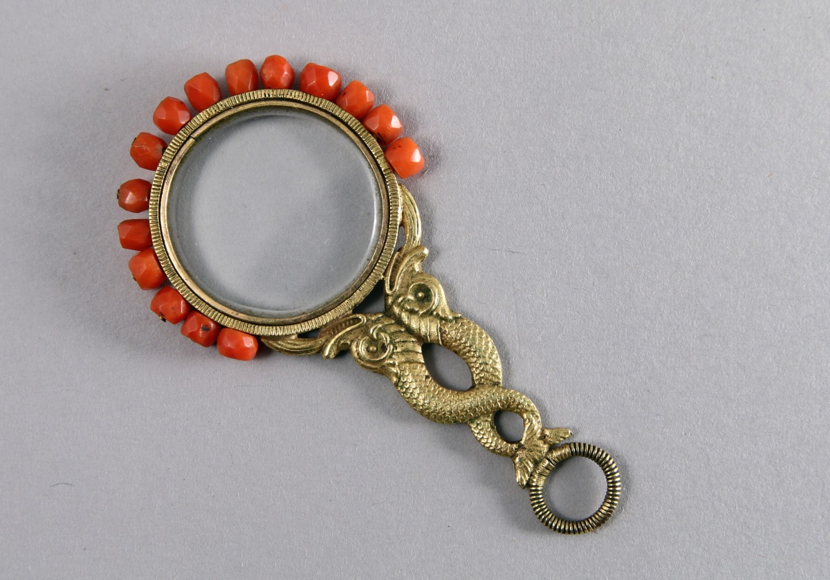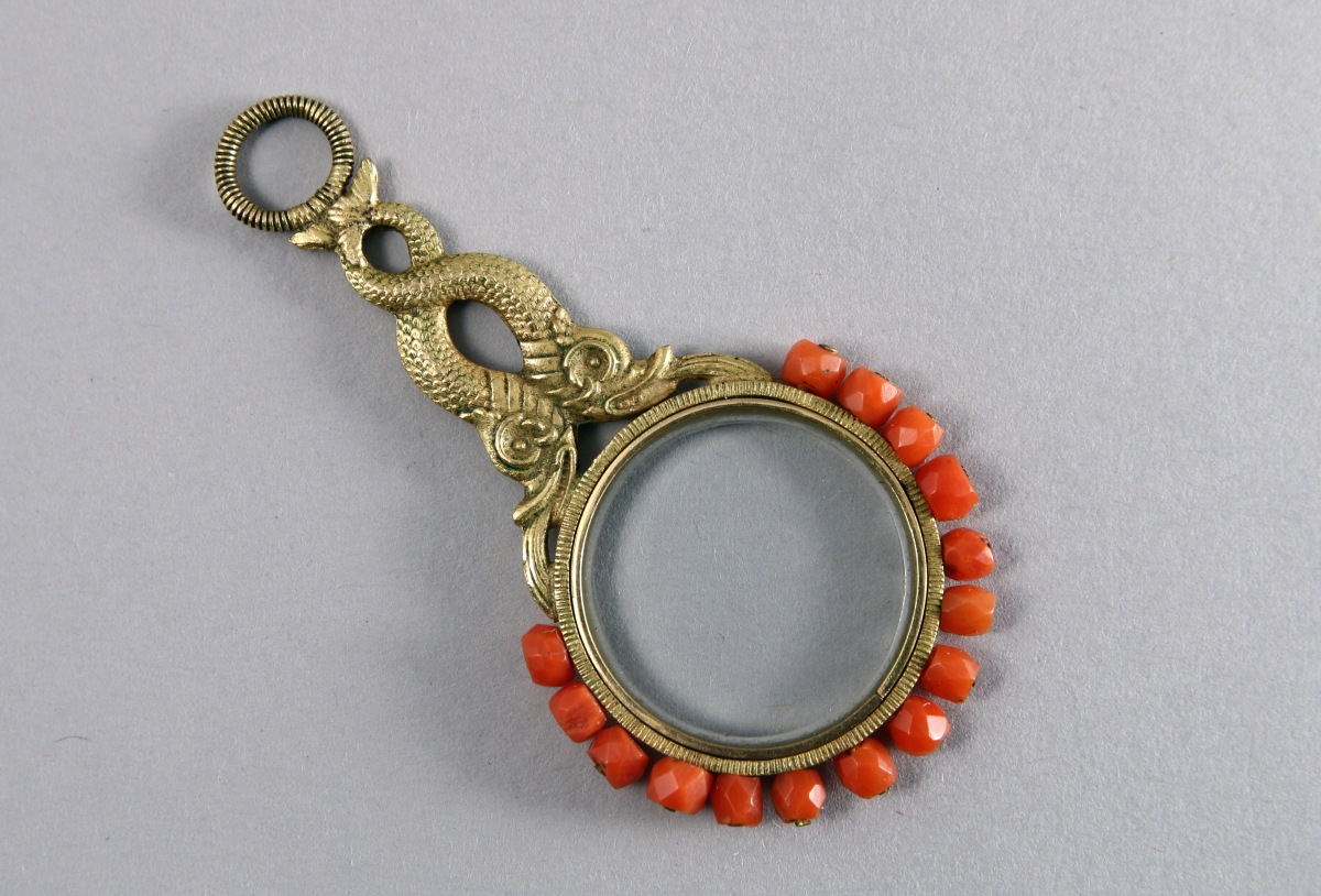 Petite LOUPE dite "de COL" en bronze ciselé et doré. Le manche à décor de deux dauphins entrelacés, le tour de la lunette orné de 15 perles couleur corail facettées.