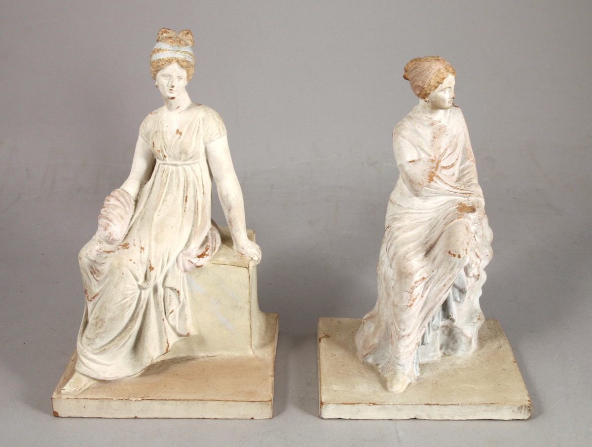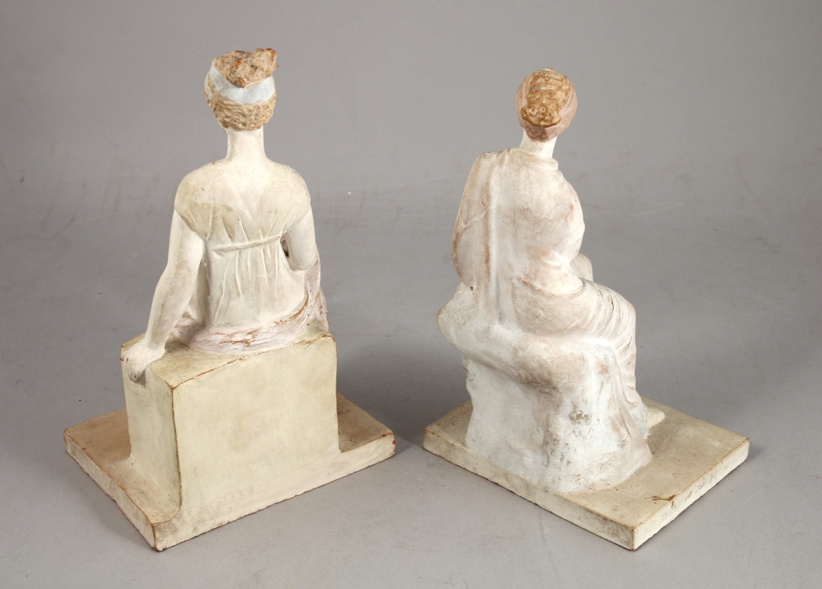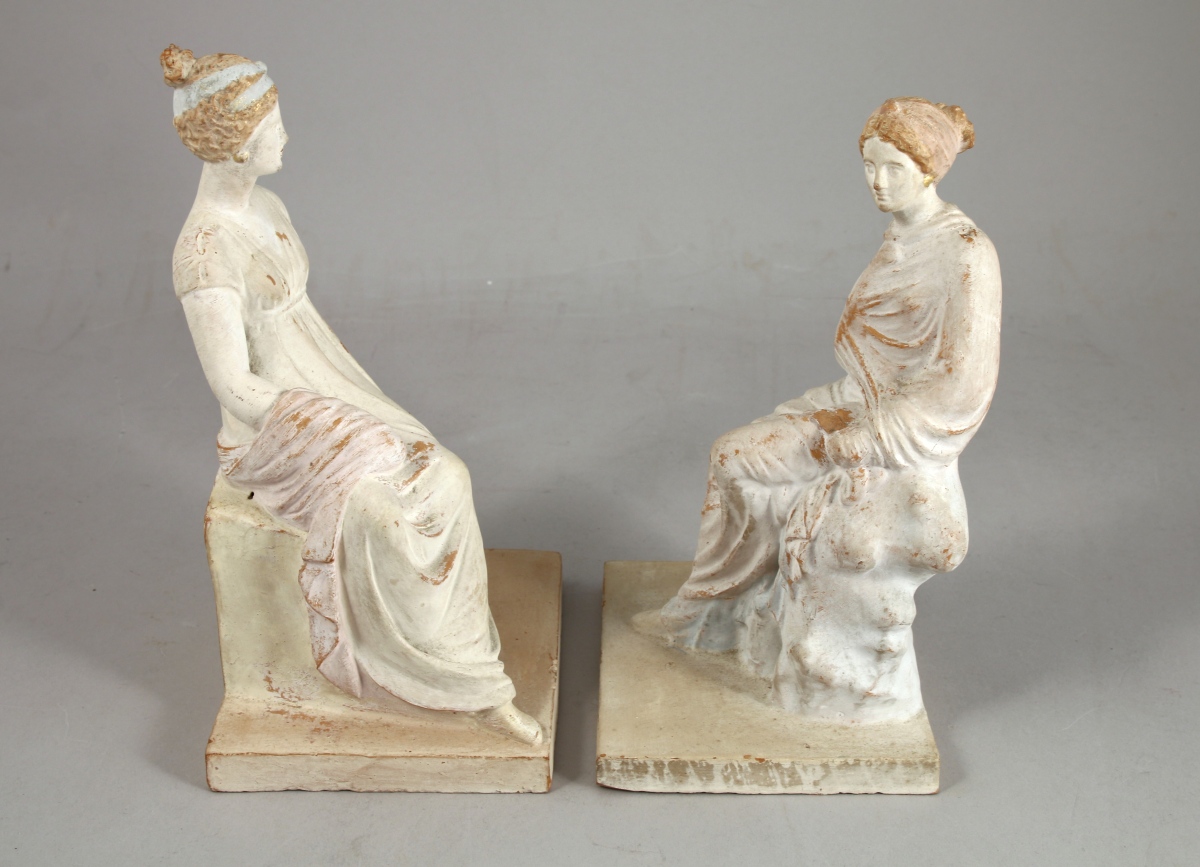 Paire de STATUETTES en terre cuite représentant des femmes péplophores assises. L'une est drapée dans son himation et assise sur un roc brut, l'autre est vetue d'une robe à l'antique ceinte sous la poitrine et assise sur un socle rectangulaire. Traces de polychromie au bleu, rose, or sur la terre cuite et effets de patine. Mention "L.I." en creux sous la base de la femme à la robe.