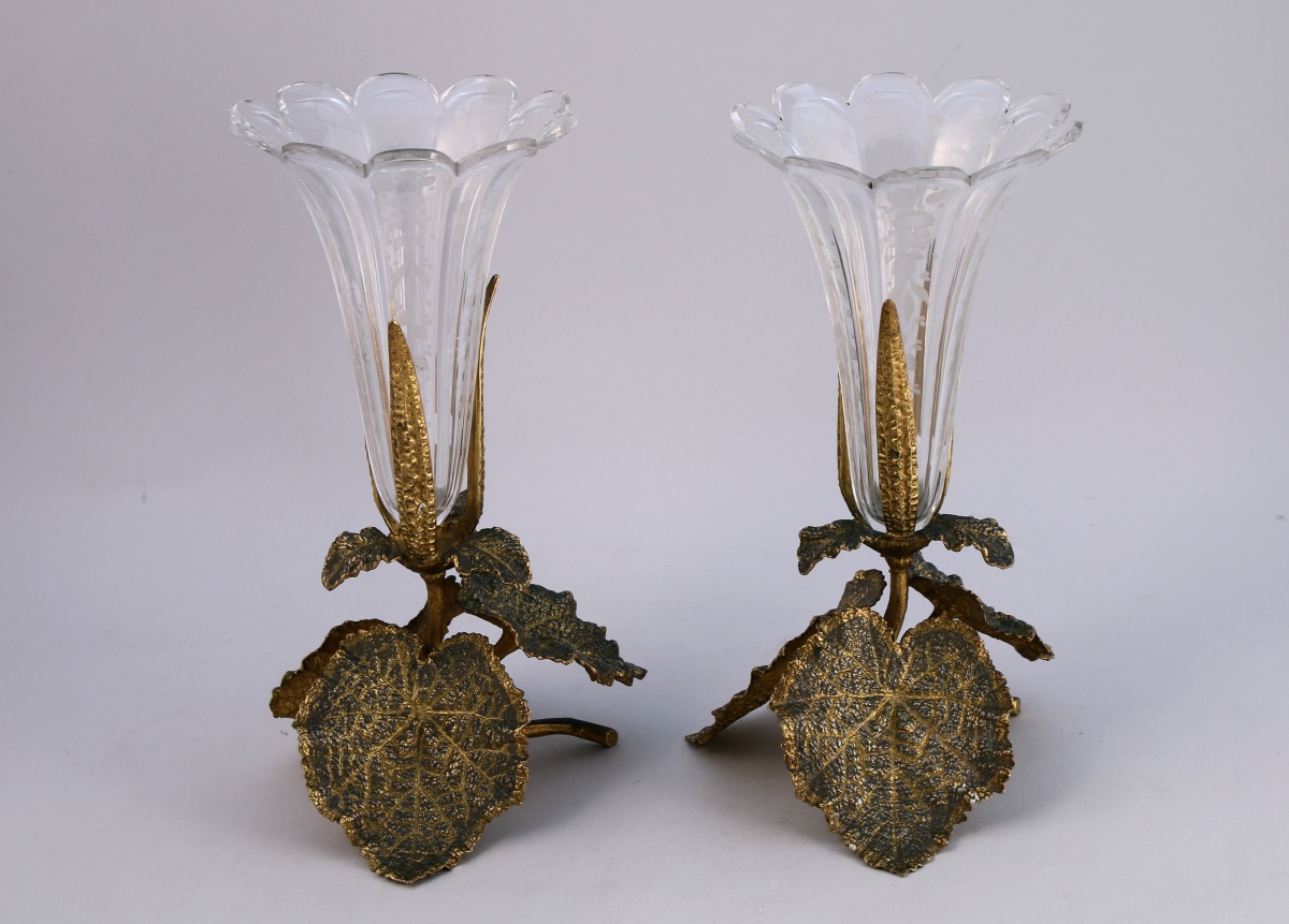Paire de VASES CORNET à pans coupés en verre à bordures polylobées. Ils sont gravés de motifs de fleurs et de feuilles. Montures en bronze figurant une branche de tilleuil dont deux feuilles servent de piètement.
