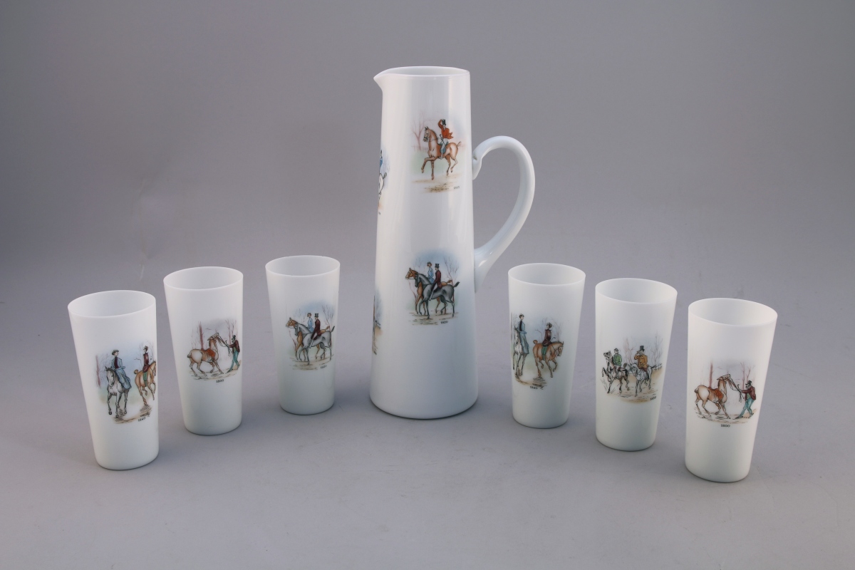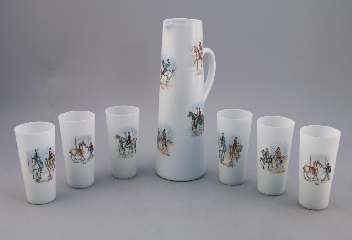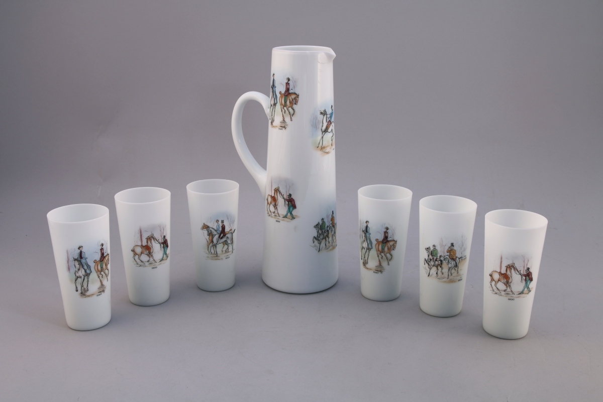SERVICE à ORANGEADE, SEPT PIÈCES. Il se compose d'UN PICHET et de SIX VERRES en verre opalin, à décor d'élégants cavaliers du XIXème siècle. Marque "ORWAL FRANCE".