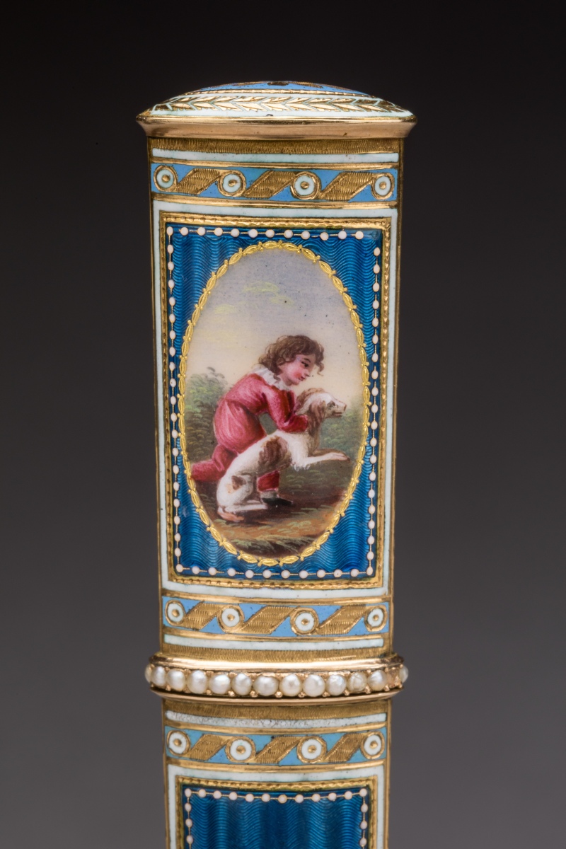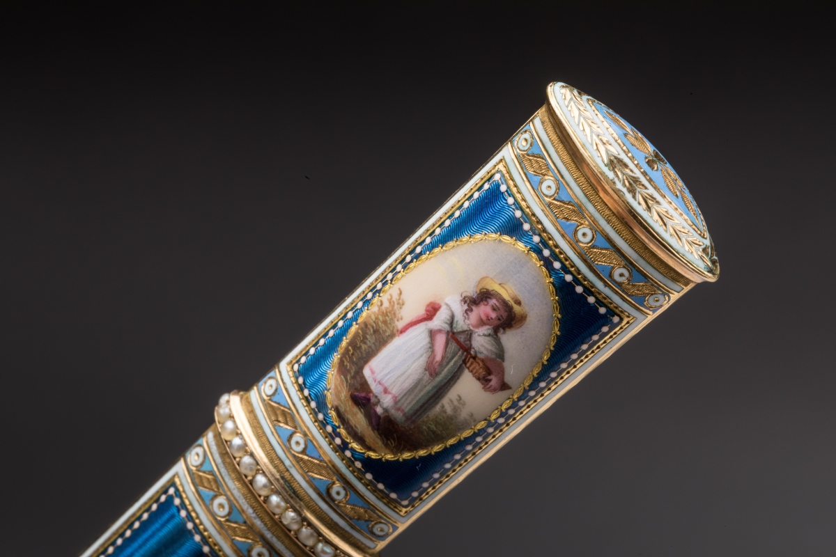 A pink gold NEDDLE CASE with four polychrome enameled medallions on a blue enameled guilloché ground. Neoclassicism period ?