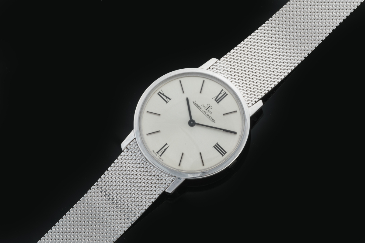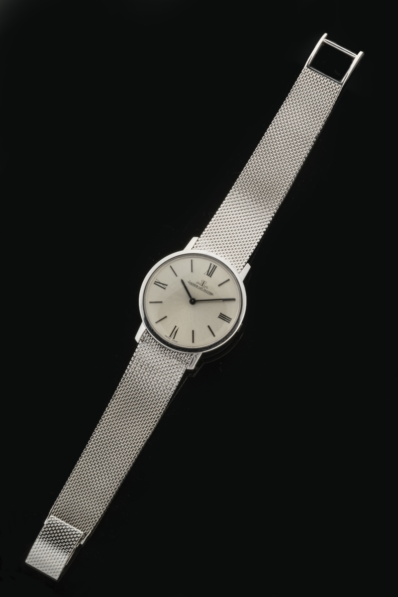 JAEGER LECOULTRE. MONTRE bracelet d'homme en or gris 750 millièmes, la montre plate de forme ronde, cadran satiné, index bâtonnets, bracelet souple tressé. Mouvement mécanique.