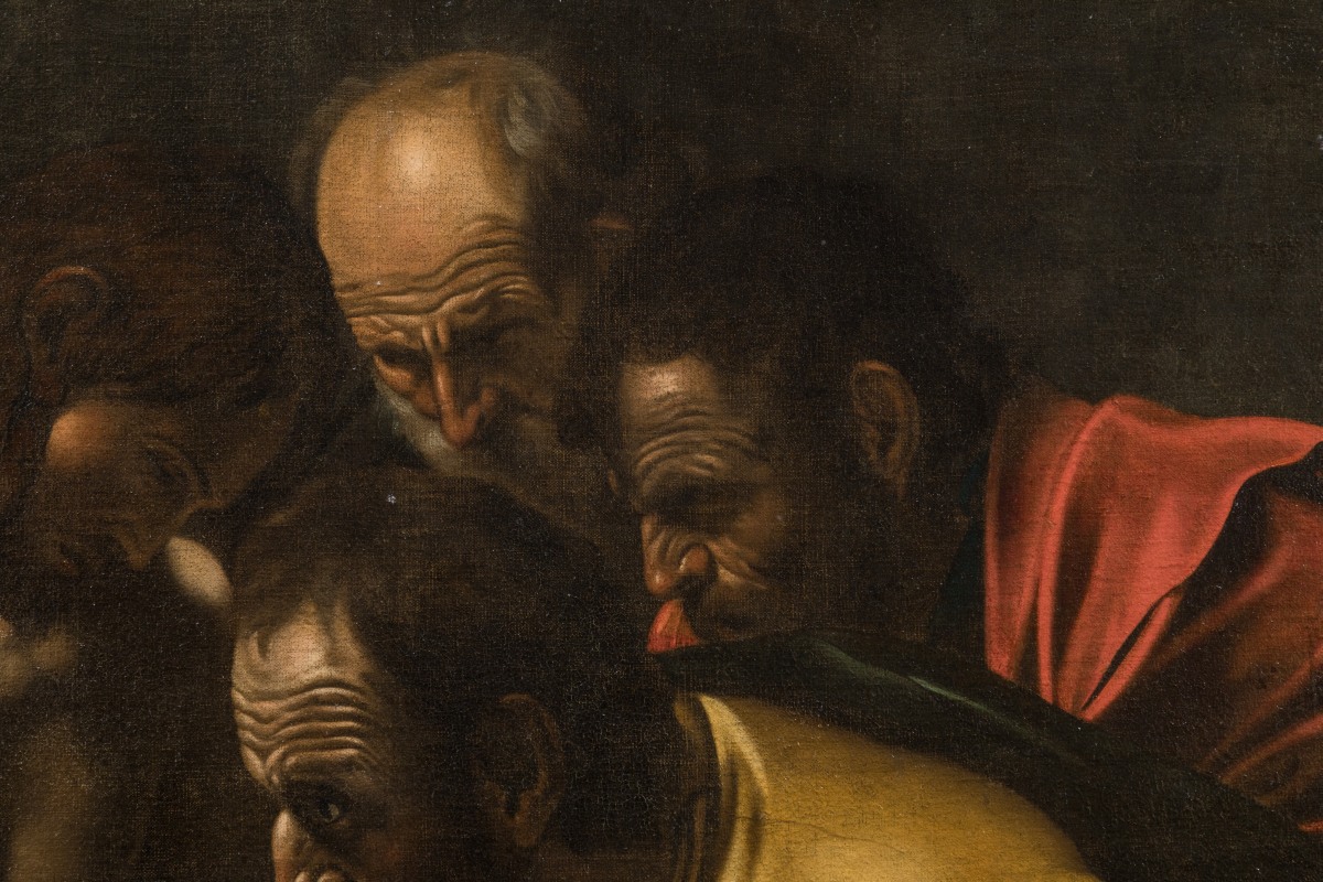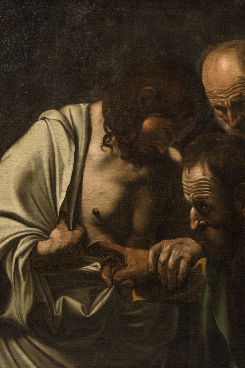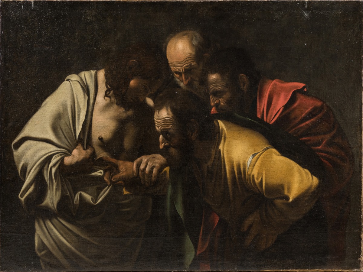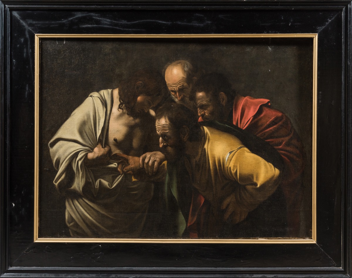 ITALIAN school c. 1600, circle of CARAVAGGIO. The disbelief of St. Thomas. Canvas holding a signature upper left : "M. CHARAVAGGIO".