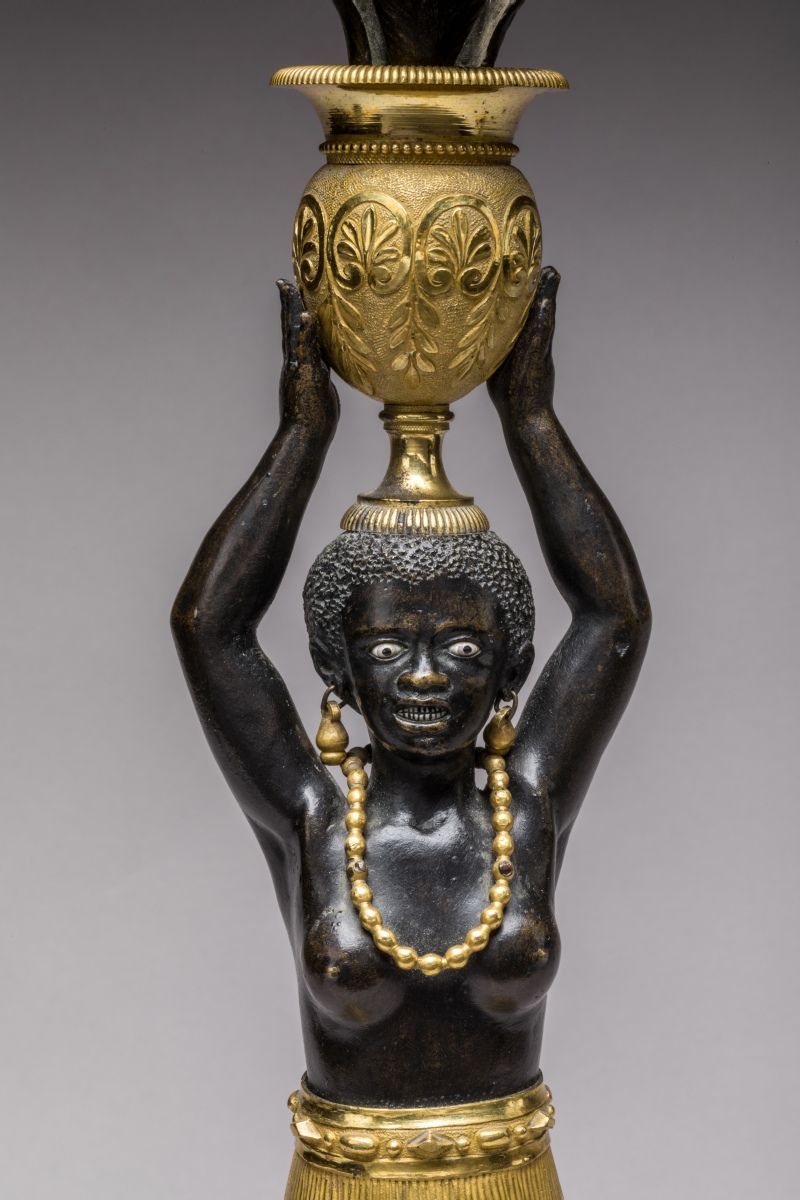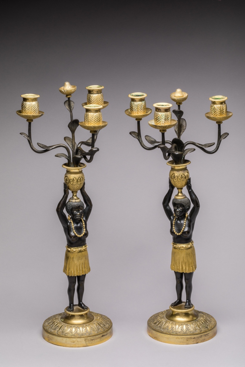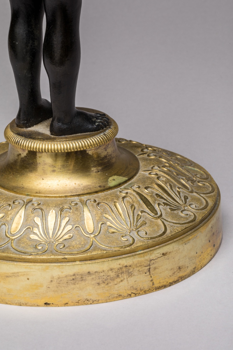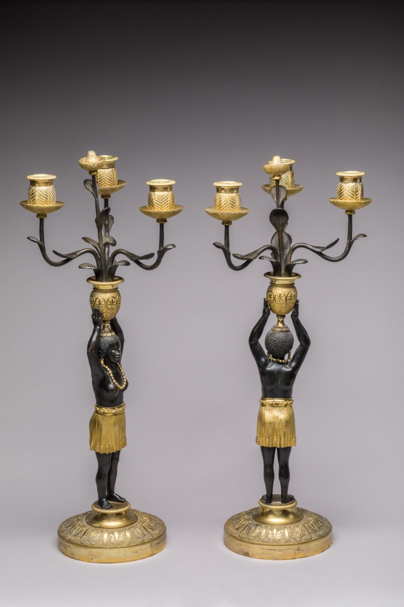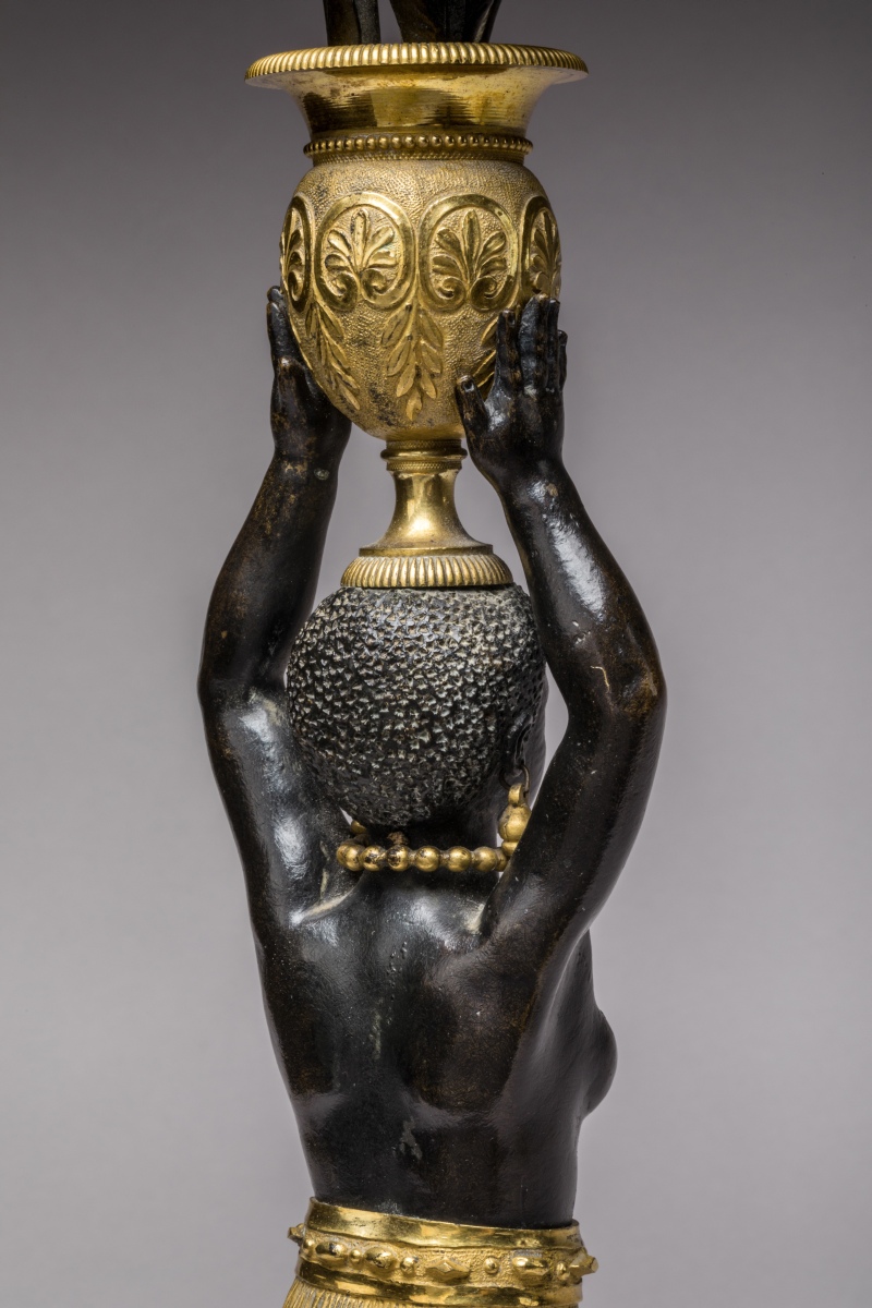 en bronze patiné et doré ormés de figurines vêtues d'un pagne, la tête aux yeux incrustés de coquillages, et portant des boucles d'oreilles mobiles et un collier de perles dorées. Elles soutiennent un vase où s'épanouissent quatre tiges feuillues, trois portent des bobèches, celle du centre un bouton de fleur.