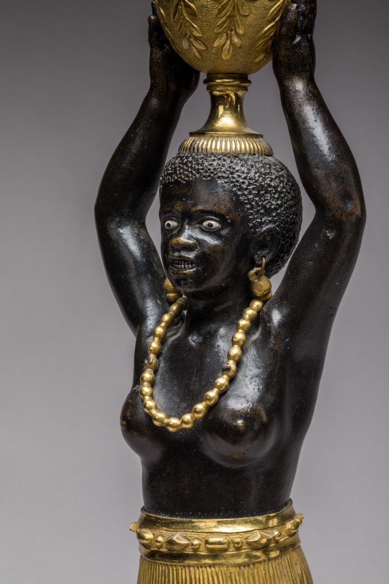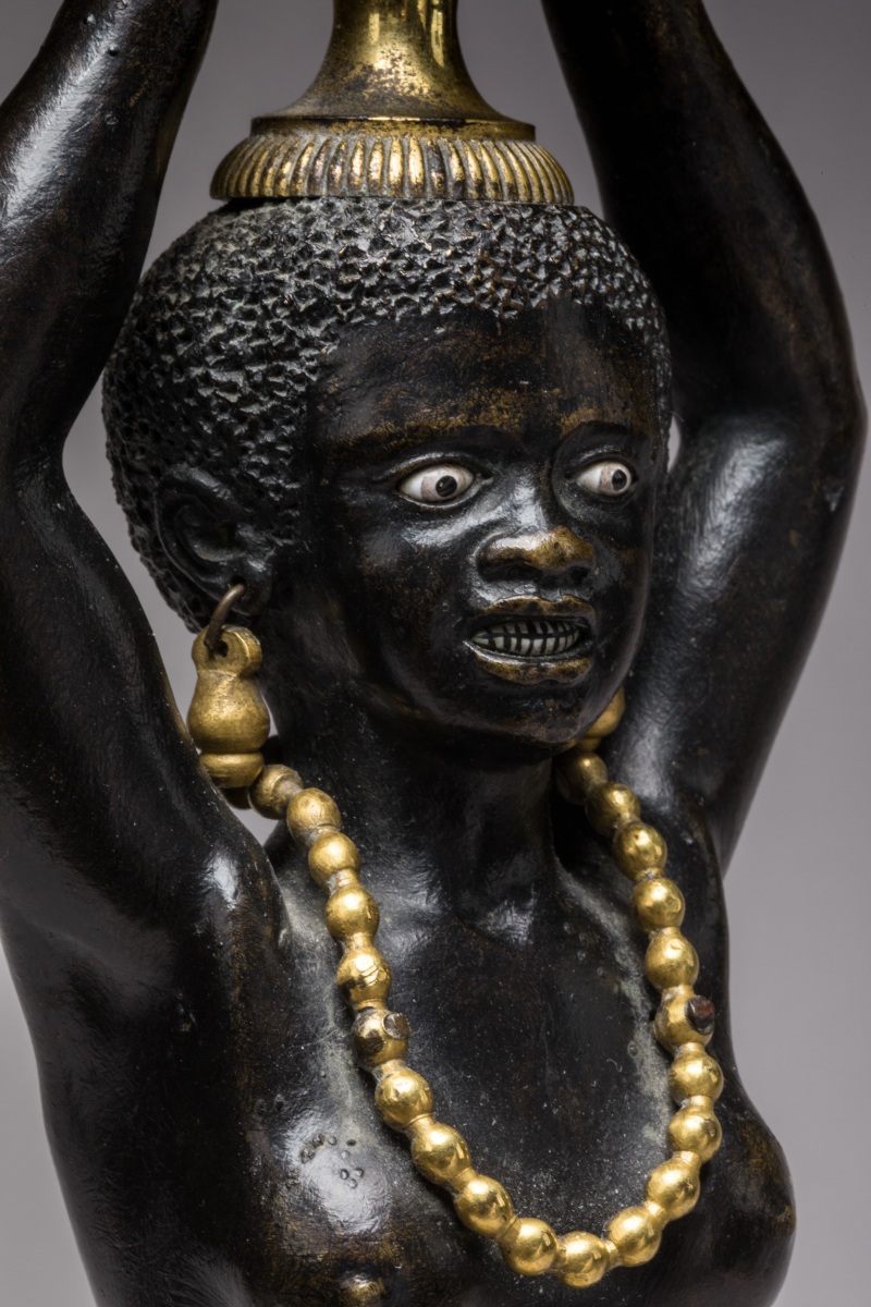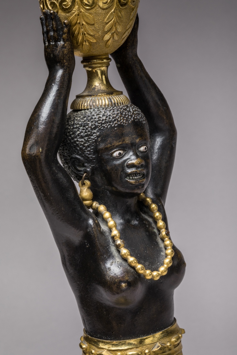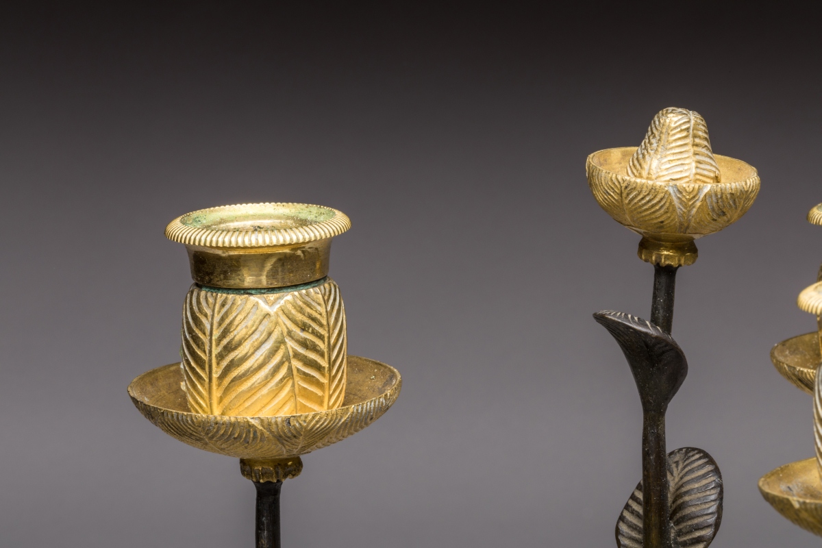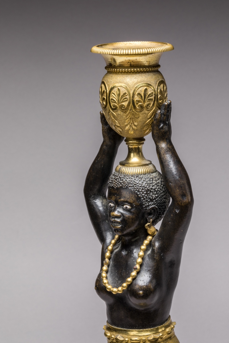 en bronze patiné et doré ormés de figurines vêtues d'un pagne, la tête aux yeux incrustés de coquillages, et portant des boucles d'oreilles mobiles et un collier de perles dorées. Elles soutiennent un vase où s'épanouissent quatre tiges feuillues, trois portent des bobèches, celle du centre un bouton de fleur.
