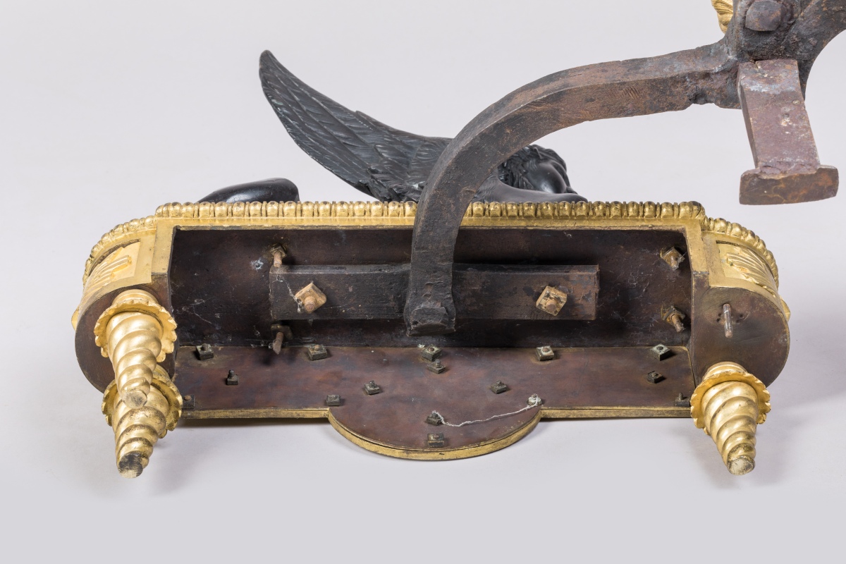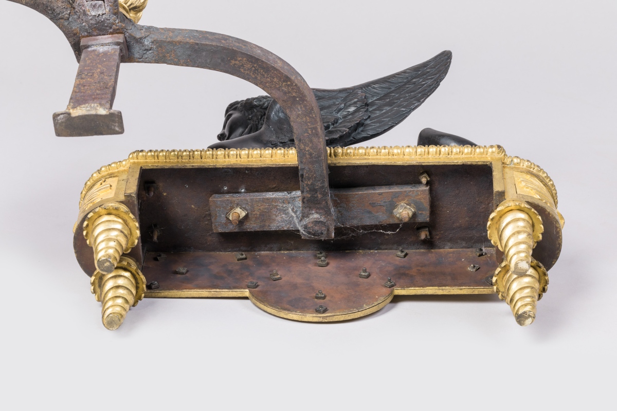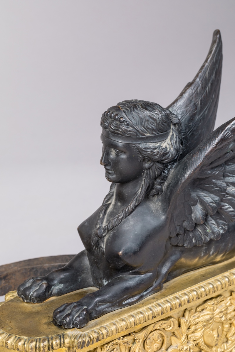 en bronze ciselé, doré et patiné. Les sphinges, en bronze patiné noir, se tiennent couchées sur une base de forme oblongue en bronze doré. Cette dernière est, sur le devant, appliquée d'un masque d'Apollon flanqué de lauriers inscrits dans des rinceaux et, sur les côtés, d'une étoile rayonnante. Ils reposent sur quatre pieds fuselés ornés de godrons torsadés. Les fers à flammes quadripodes sont enrichis d'une urne couverte et d'une flamme, et appliqués d'un motif floral retenu par un ruban noué.