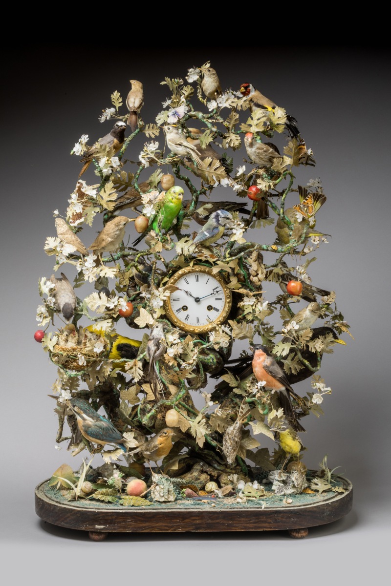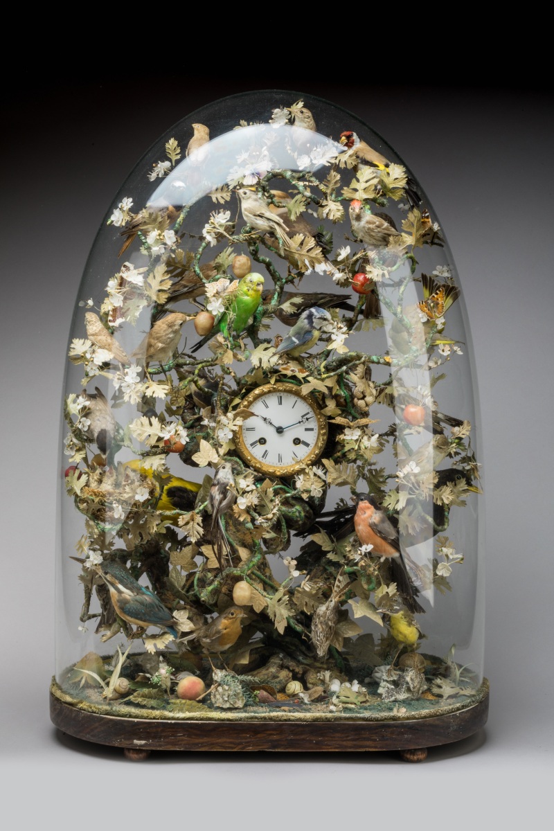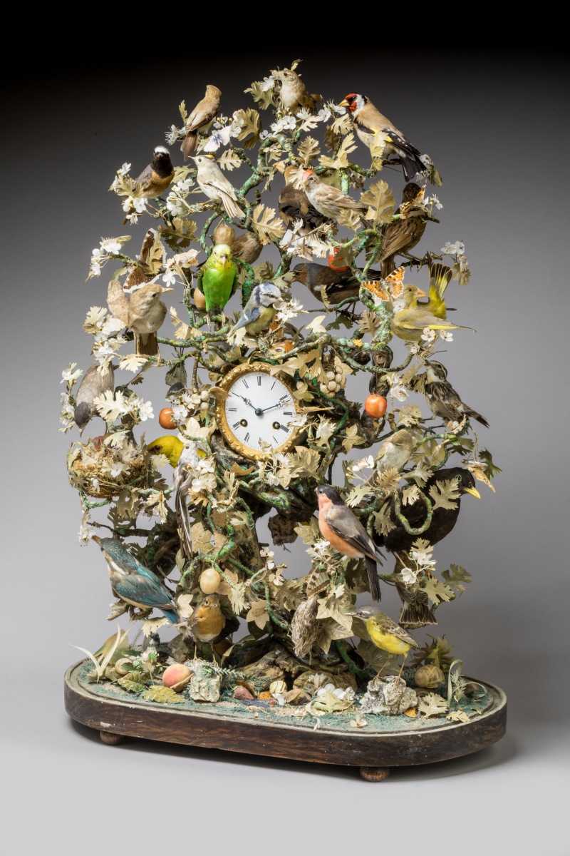 A striking MANTEL CLOCK, the dial on a flowered SHRUB with 30 PERCHED BIRDS. Under a glass globe. Late 19th century.
