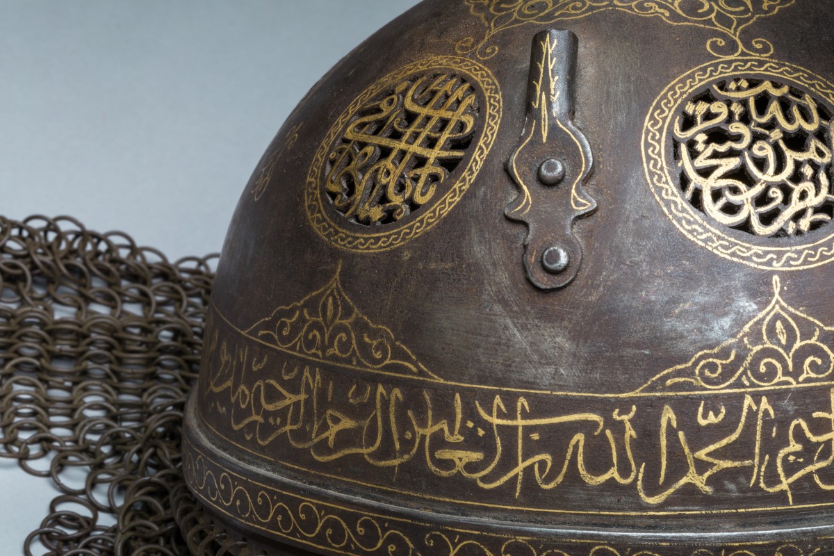La bombe en fer orné d'or incrusté en bordure de cartouches avec écritures et sur le corps de six médaillons ronds à jours ornés d'écritures coraniques et de frises.