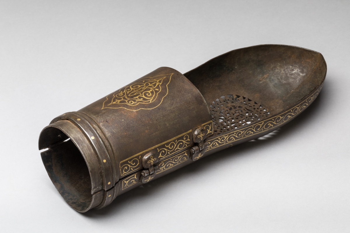 - BRASSARD de défense " Bâzouband " en fer orné en suite à l'or de deux grands médaillons ronds à jours.