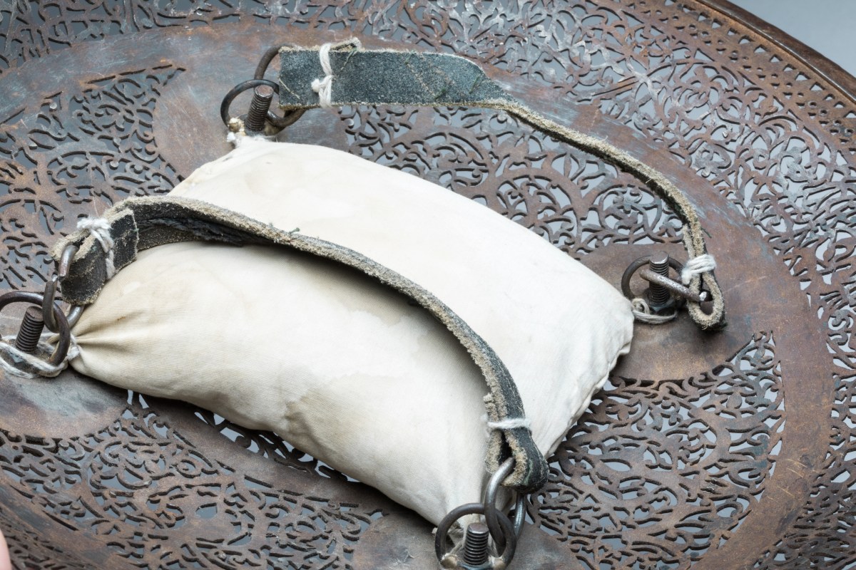 Deux porte-plumail de part et d'autre d'un nasal mobile décoré d'un médaillon à jours en partie haute et de palmettes à la base.