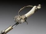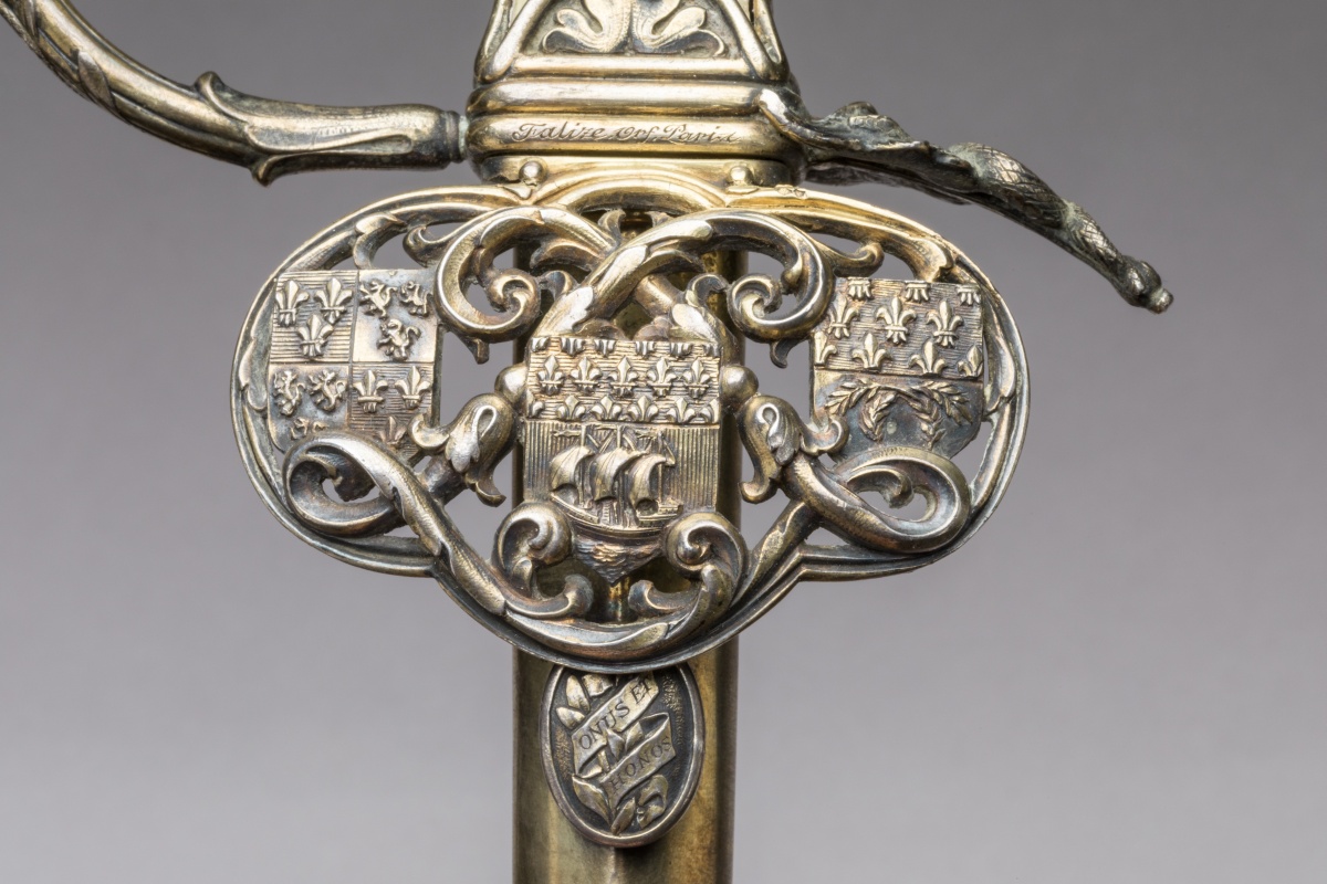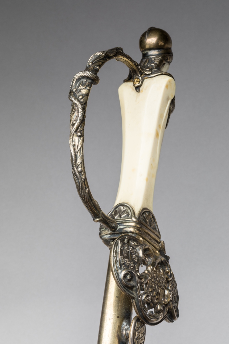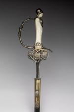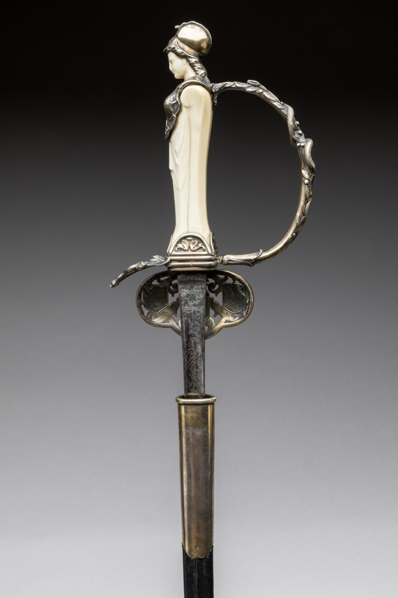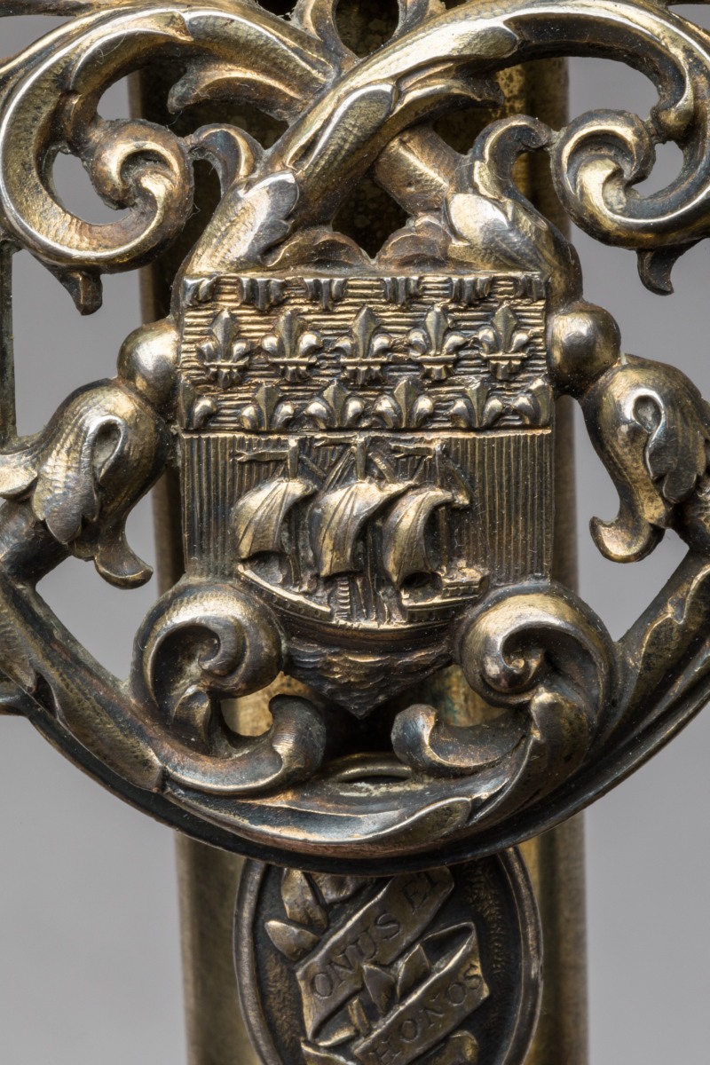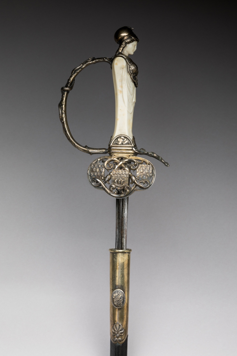 Monture en vermeil. Fusée et pommeau en ivoire sculpté représentant "Athéna casquée" portant une cuirasse à décor d'écailles et tête de Méduse en vermeil. Garde à une branche ornée de feuilles de laurier surmontée d'un serpent enlacé, noeud de corps à quatre demi-oreillons ciselés de feuillages et quillon ciselé à jours d'un caducée (faisant référence à la carrière de médecin). Clavier sculpté à jours, enrichi de trois blasons sur deux "L" entrecroisés (ses initiales), à gauche les armes de "Picardie" (berceau de la famille, Landouzy la Ville), au centre celles de "Paris" (lieu où il exerce une partie de sa carrière) et à droite celles de "Reims" (où Landouzy est né). Lame triangulaire de "Coulaux à Klingenthal", gravée au tiers de rinceaux feuillagés. Fourreau en chagrin noir à deux garnitures en vermeil. Chape à bouton ovale ciselé et gravé "Onus et Honos" (Honneur et responsabilité, la devise que l'on retrouvait sur son cachet). Bouterolle à décor en suite.