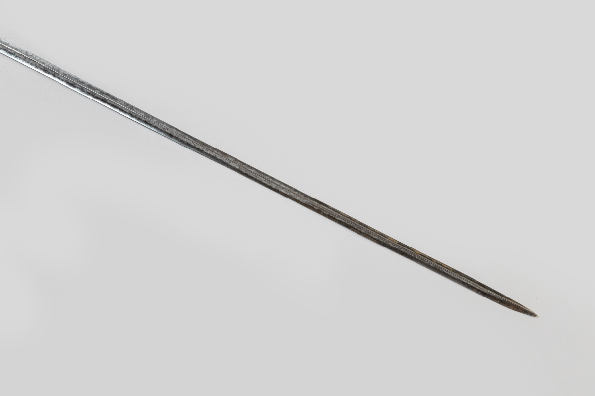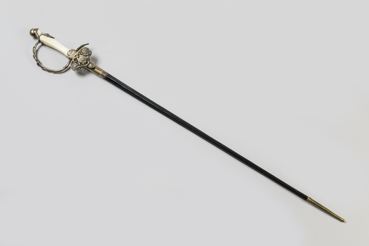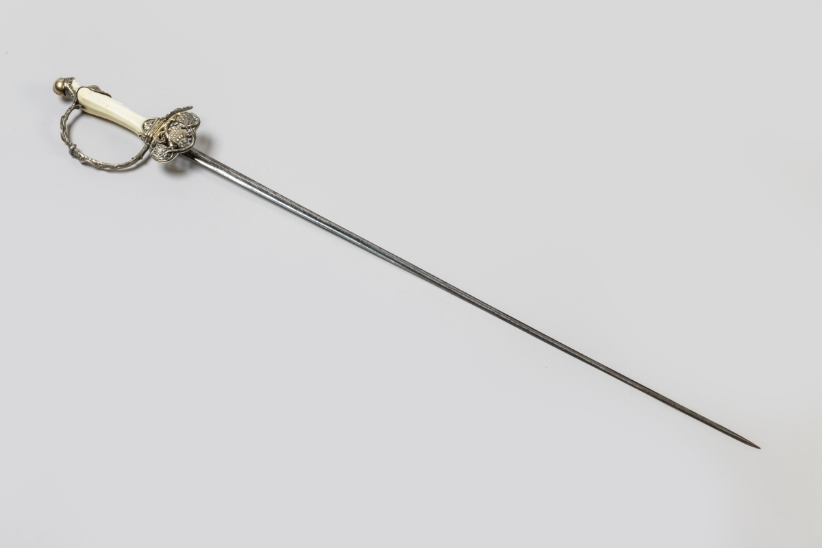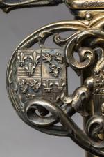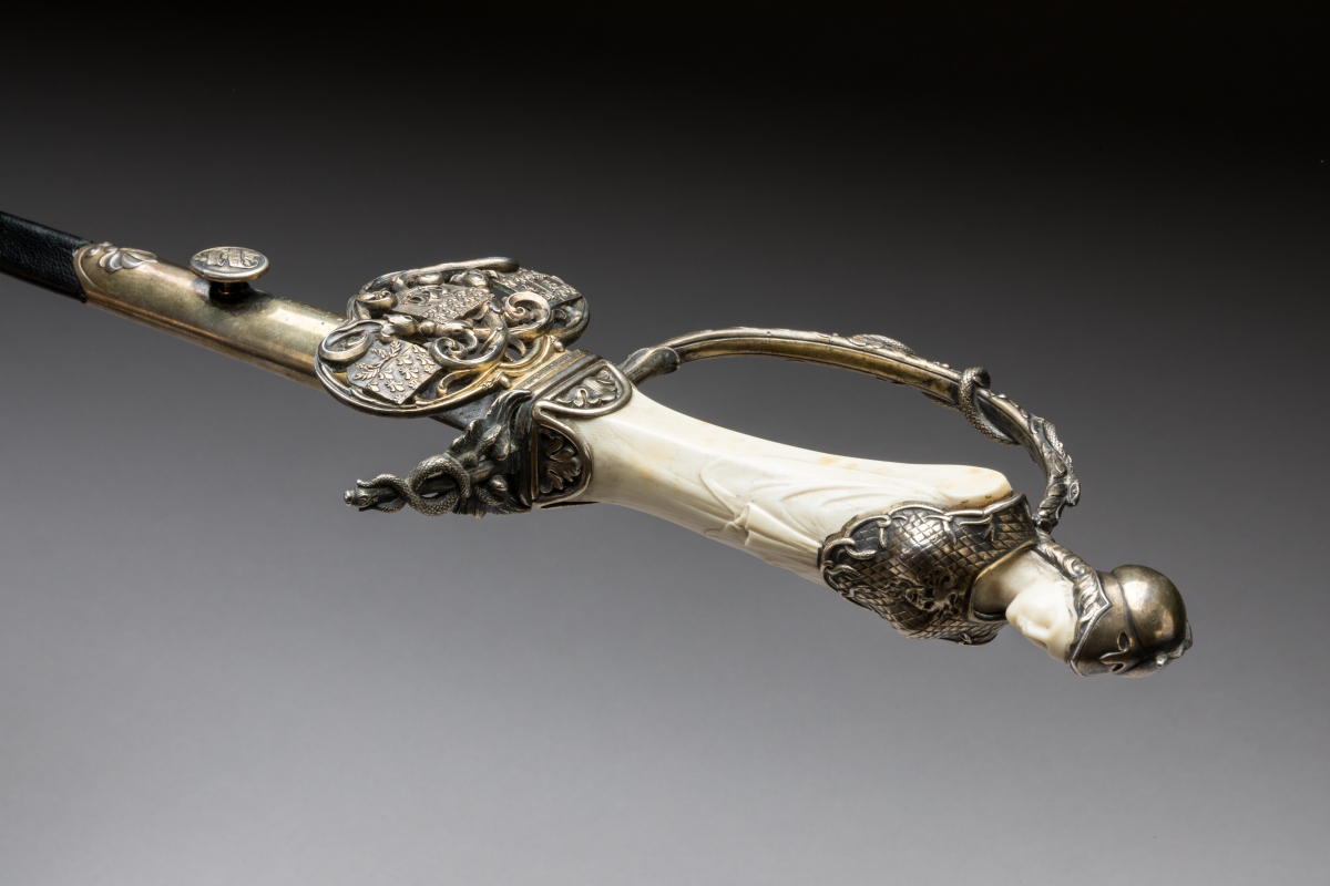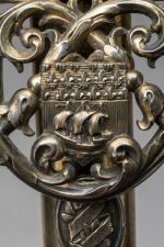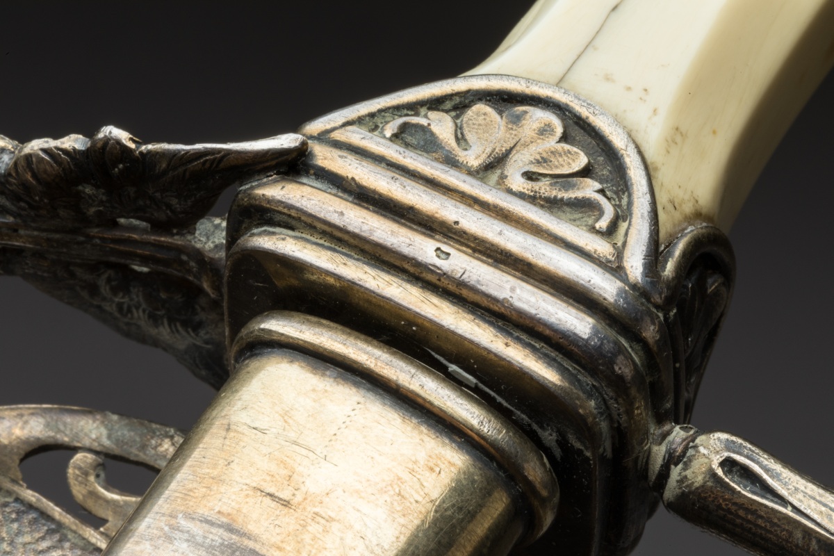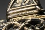 Monture en vermeil. Fusée et pommeau en ivoire sculpté représentant "Athéna casquée" portant une cuirasse à décor d'écailles et tête de Méduse en vermeil. Garde à une branche ornée de feuilles de laurier surmontée d'un serpent enlacé, noeud de corps à quatre demi-oreillons ciselés de feuillages et quillon ciselé à jours d'un caducée (faisant référence à la carrière de médecin). Clavier sculpté à jours, enrichi de trois blasons sur deux "L" entrecroisés (ses initiales), à gauche les armes de "Picardie" (berceau de la famille, Landouzy la Ville), au centre celles de "Paris" (lieu où il exerce une partie de sa carrière) et à droite celles de "Reims" (où Landouzy est né). Lame triangulaire de "Coulaux à Klingenthal", gravée au tiers de rinceaux feuillagés. Fourreau en chagrin noir à deux garnitures en vermeil. Chape à bouton ovale ciselé et gravé "Onus et Honos" (Honneur et responsabilité, la devise que l'on retrouvait sur son cachet). Bouterolle à décor en suite.
