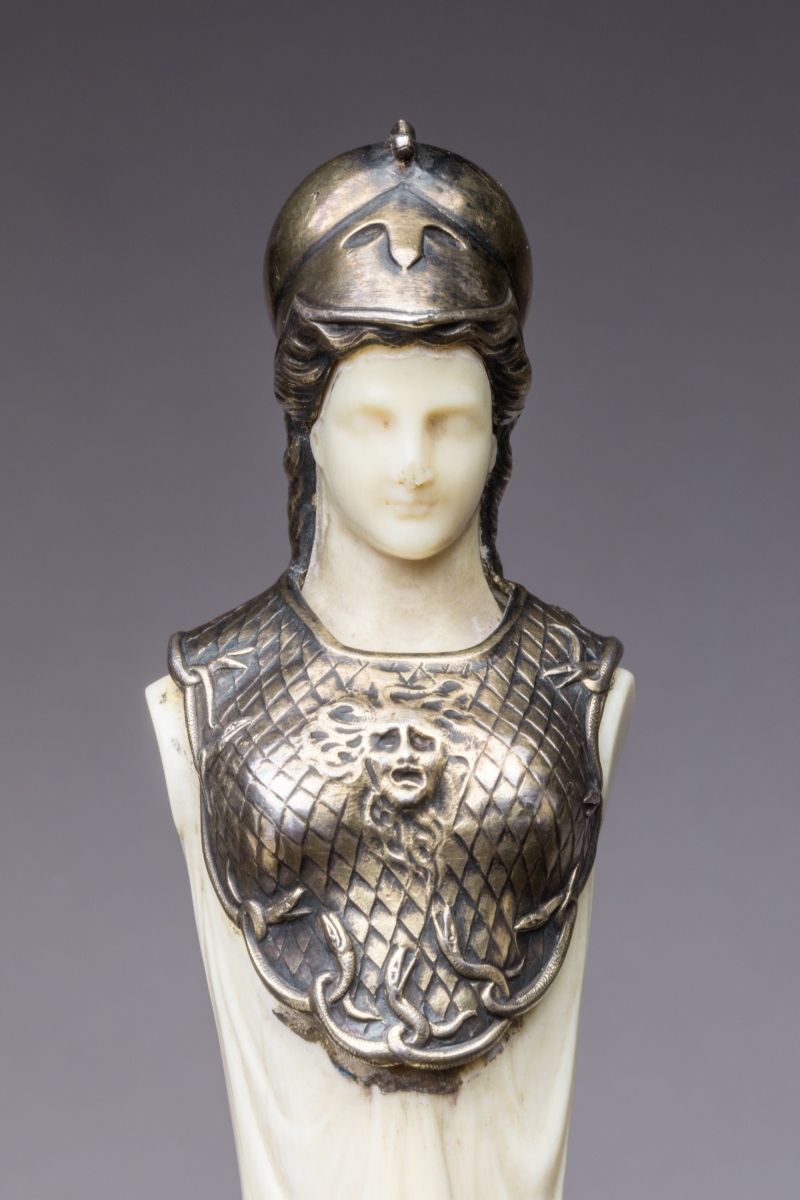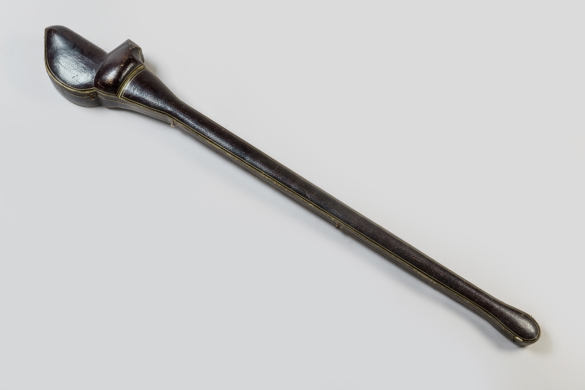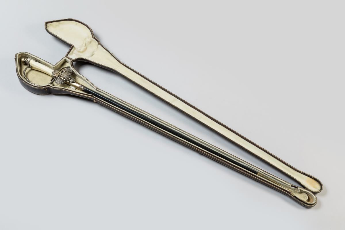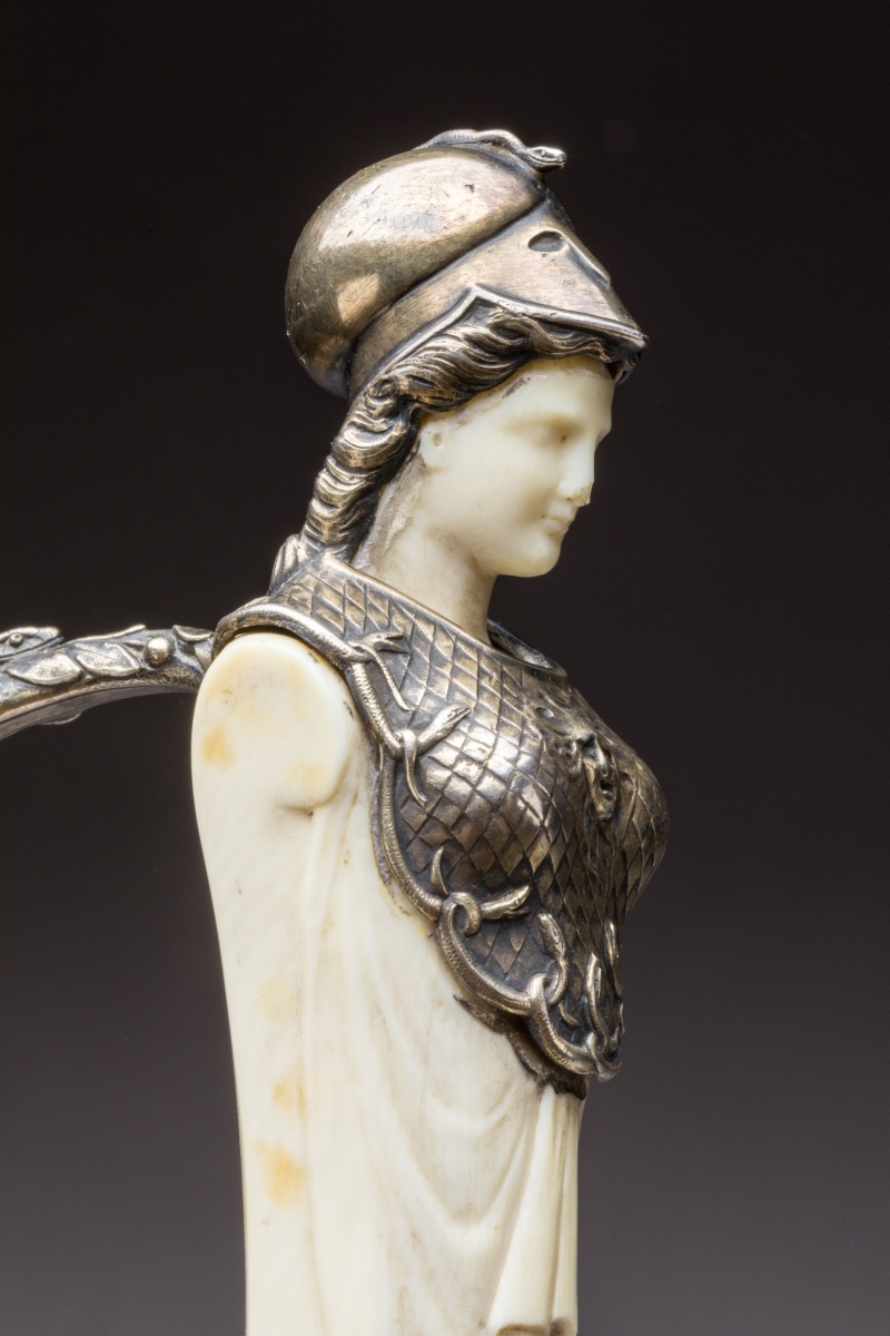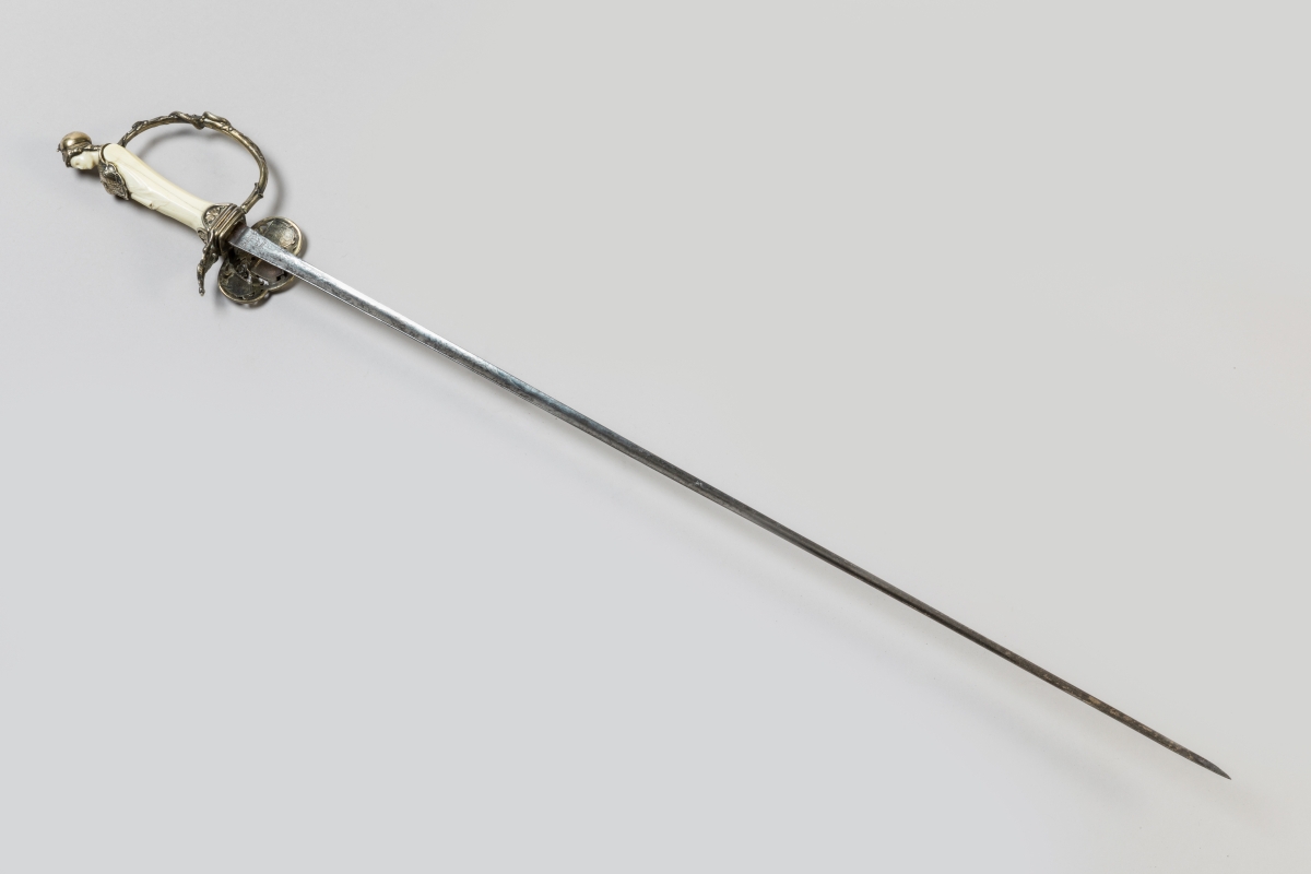 Monture en vermeil. Fusée et pommeau en ivoire sculpté représentant "Athéna casquée" portant une cuirasse à décor d'écailles et tête de Méduse en vermeil. Garde à une branche ornée de feuilles de laurier surmontée d'un serpent enlacé, noeud de corps à quatre demi-oreillons ciselés de feuillages et quillon ciselé à jours d'un caducée (faisant référence à la carrière de médecin). Clavier sculpté à jours, enrichi de trois blasons sur deux "L" entrecroisés (ses initiales), à gauche les armes de "Picardie" (berceau de la famille, Landouzy la Ville), au centre celles de "Paris" (lieu où il exerce une partie de sa carrière) et à droite celles de "Reims" (où Landouzy est né). Lame triangulaire de "Coulaux à Klingenthal", gravée au tiers de rinceaux feuillagés. Fourreau en chagrin noir à deux garnitures en vermeil. Chape à bouton ovale ciselé et gravé "Onus et Honos" (Honneur et responsabilité, la devise que l'on retrouvait sur son cachet). Bouterolle à décor en suite.