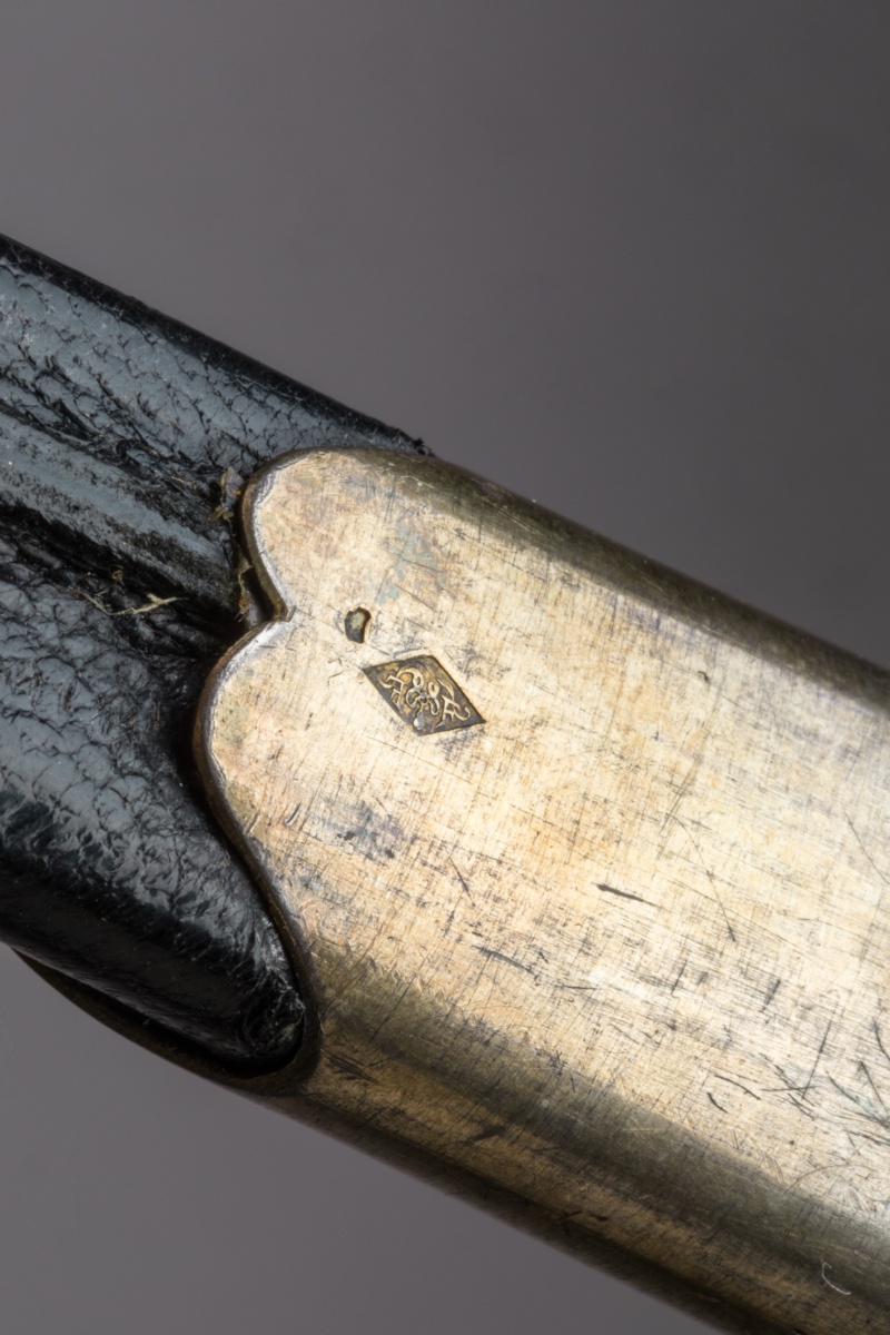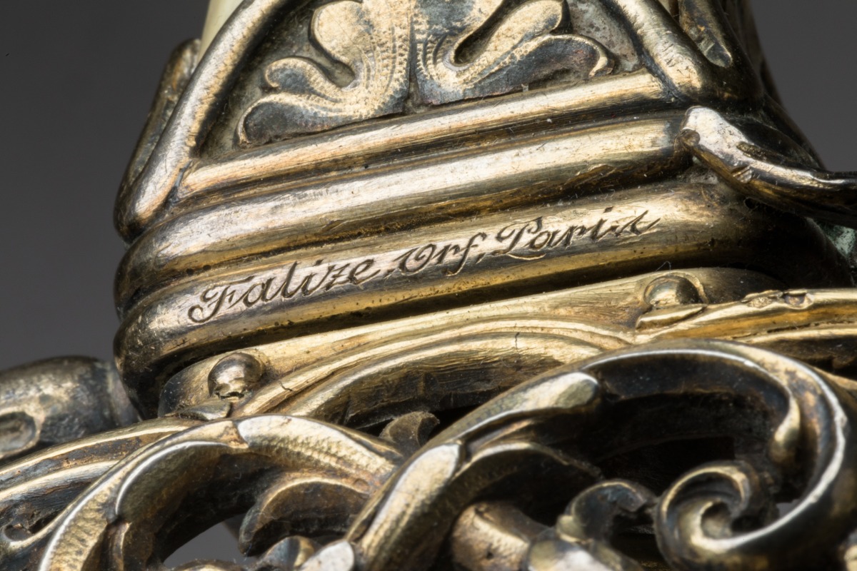 Poinçons sur le noeud de corps et sur la chape, poinçon au double "F" en symétrie entrecoupé d'un noeud perlé (Falize) et poinçon hure de sanglier.