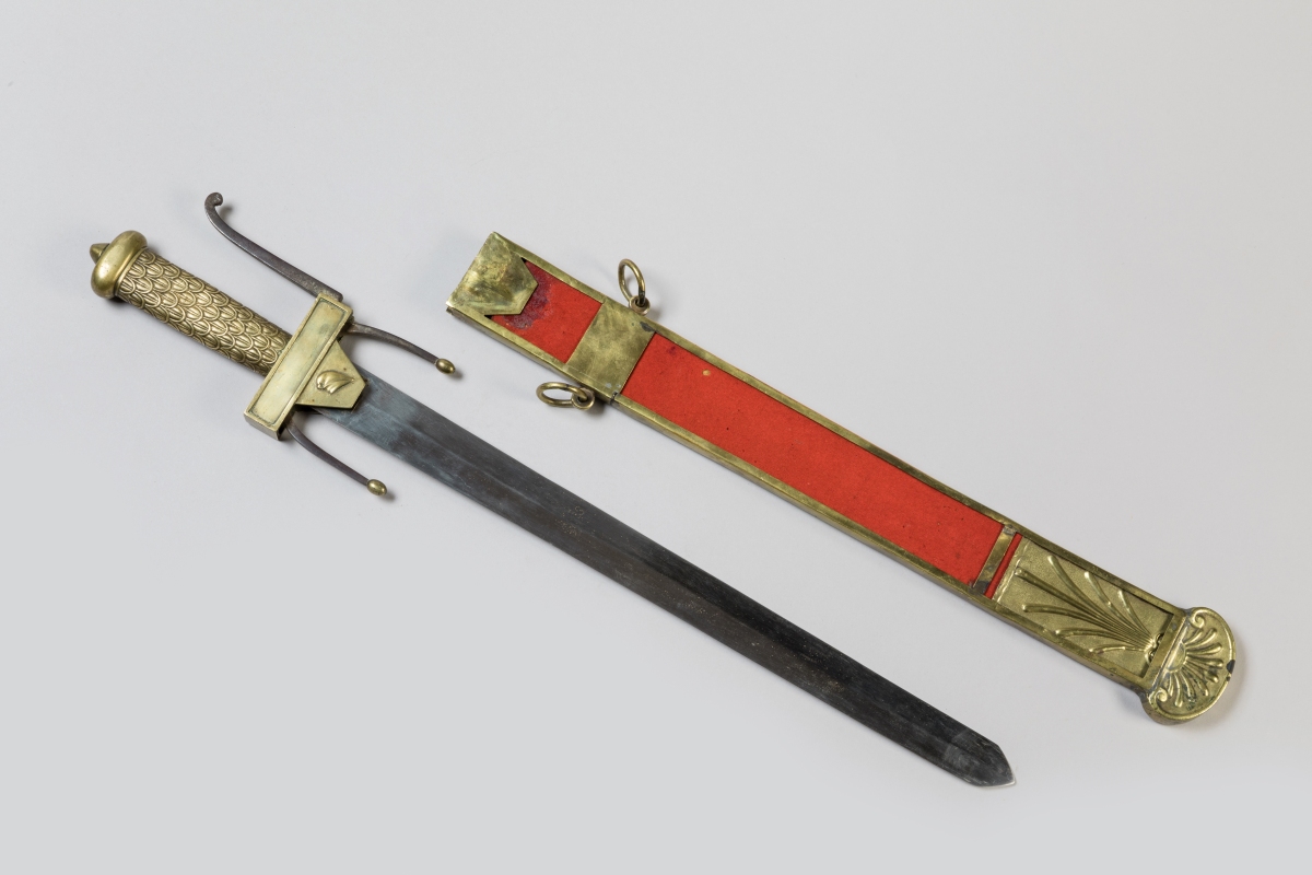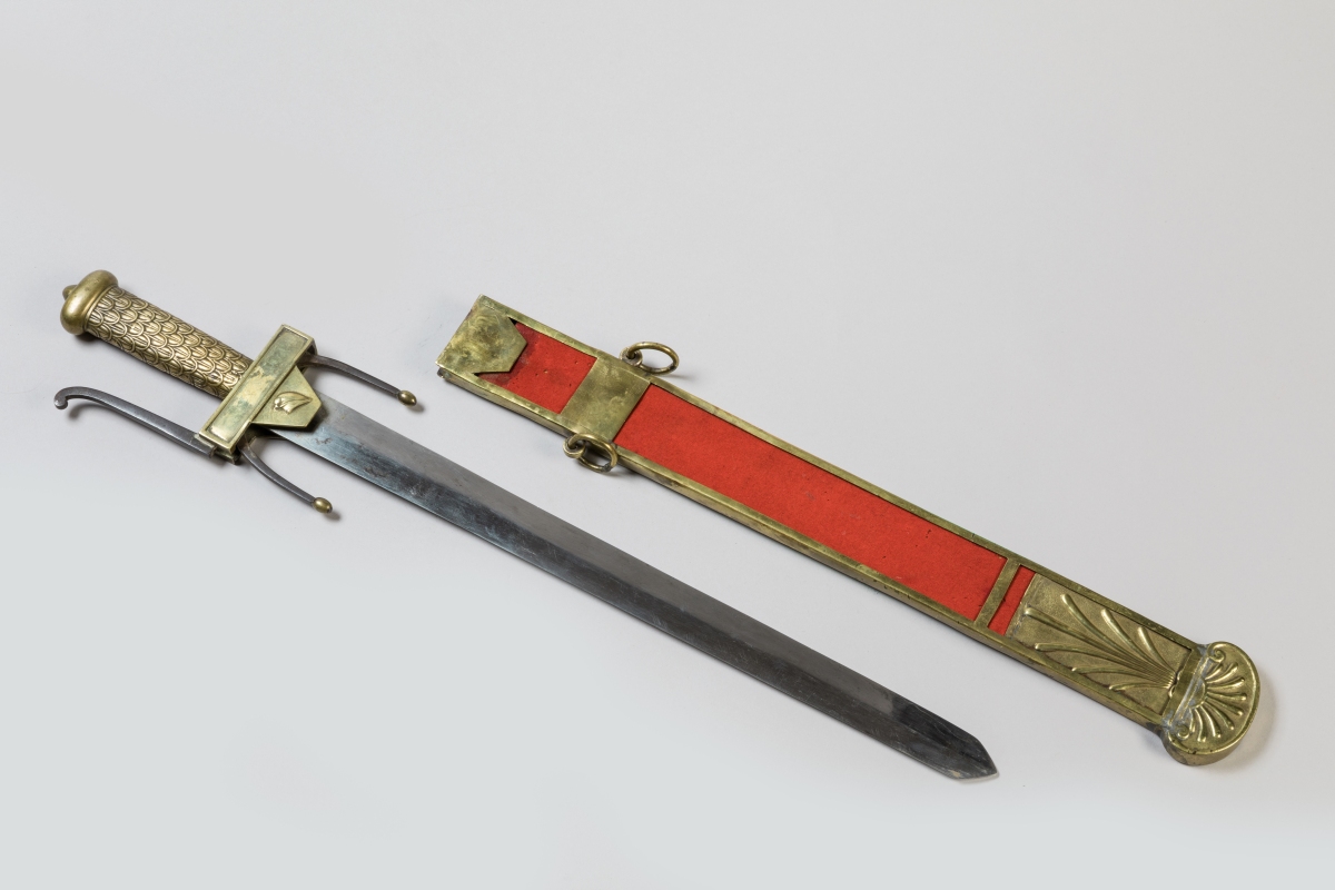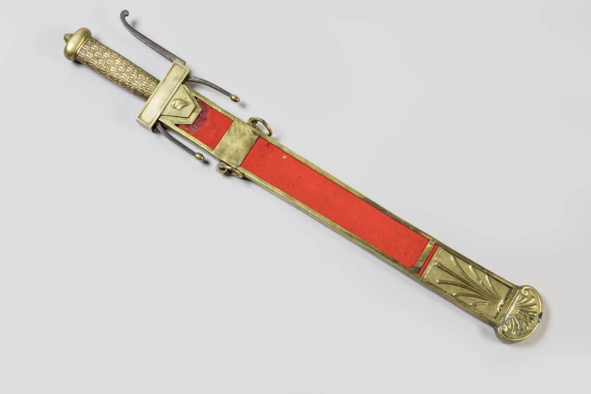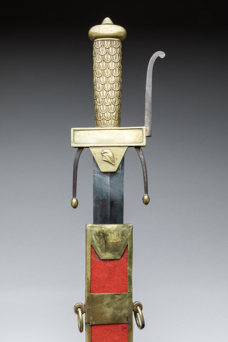 Poignée en bronze ciselé d'écailles. Garde en fer à une branche courbée aux deux tiers. Nœud de corps rectangulaire en laiton enrichi de deux demi oreillons décorés de " bonnets phrygiens " en relief portant deux quillons inclinés vers le bas se terminant par deux olives en laiton. Large lame droite à arête centrale. Fourreau en bois et laiton découpé portant deux pitons porte anneaux au tiers supérieur, à deux crevées garnies de feutre écarlate. Bouterolle et dard ornés à décor repoussé de palmettes.