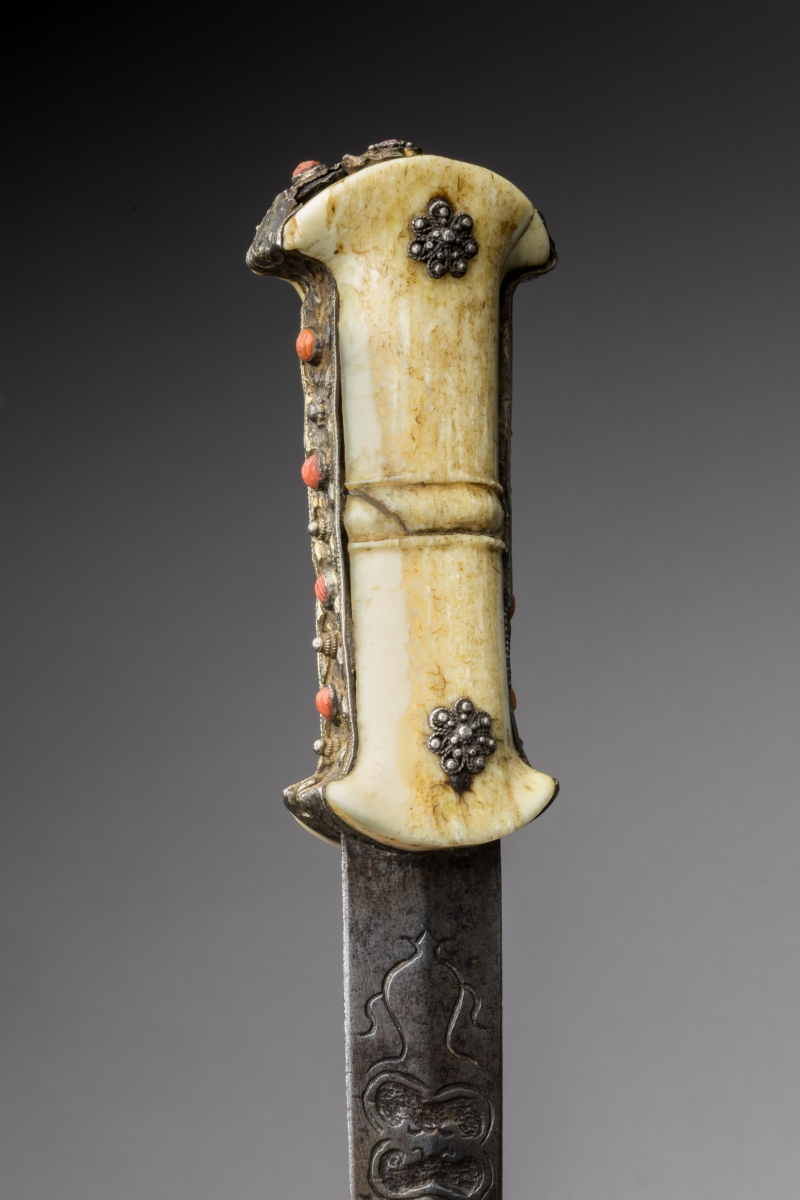 Poignée à plaquettes d'ivoire de morse à deux boutons de rivure en fleurs. Monture en argent doré ornée de cabochons enrichis de petites perles de corail. Forte lame droite à double tranchant et arête médiane, gravée au talon en relief et décoré en suite.
