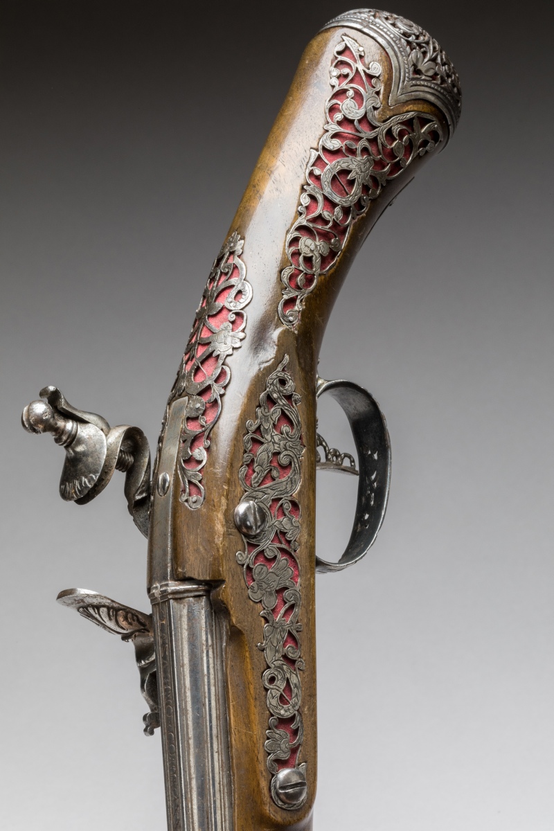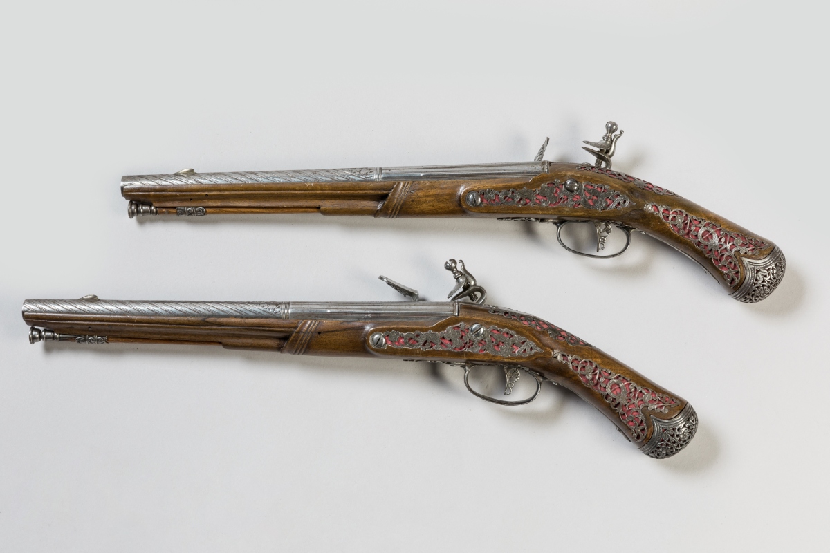 Canons ronds aux bouches, décorés en torsades et à méplats, à décor rainuré aux tonnerres, signés sur le dessus " Lazarino Cominazzo ". Platines et chiens col de cygne à corps ronds, finement ciselés en relief de rinceaux feuillagés. Bassinets et couvre-bassinets ciselés en suite. Belles garnitures en fer découpé et ajouré à fin décor de feuillages et rinceaux feuillagés. Calottes à courtes oreilles. Montures en noyer à longs fûts sculptés. Crosses et contre-platines ornées de grandes plaques en fer finement découpé et gravé à jours, en suite. Baguettes en bois à embouts en fer.