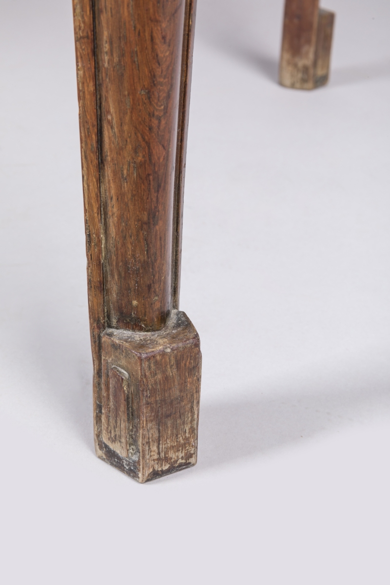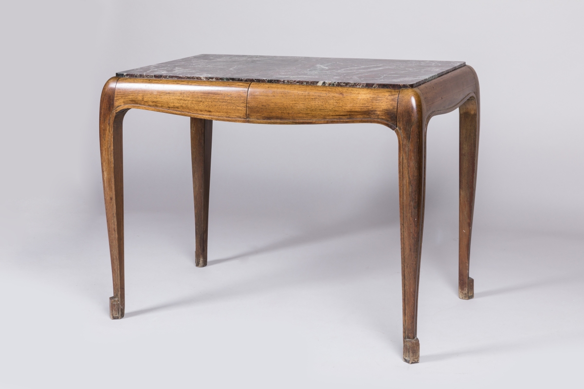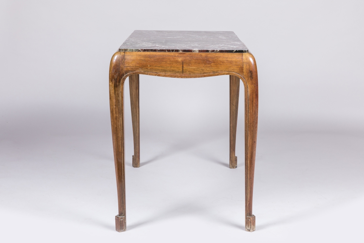 en noyer teinté acajou sur un bâti de chêne, ouvrant par deux tiroirs en ceinture, reposant sur quatre pieds. Garnie d'un marbre Levanto rouge et vert veiné de blanc.