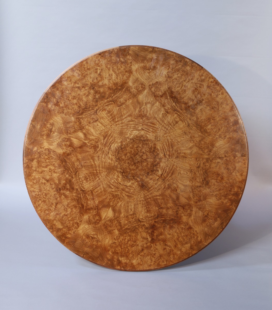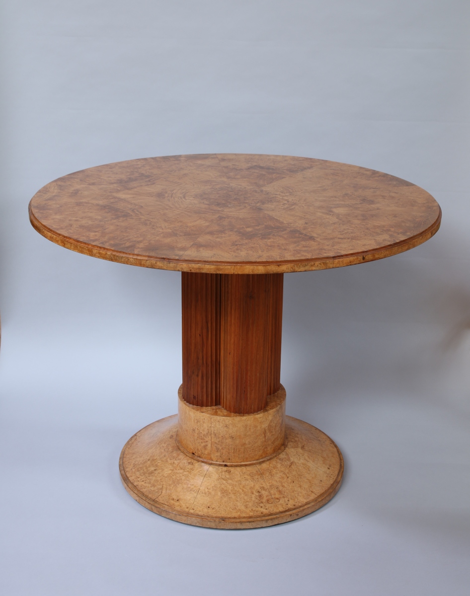 en noyer et placage de loupe d'amboine. Plateau de forme circulaire orné d'un frisage rayonnant. Le fût central à quatre colonnes imbriquées sculptées de cannelures repose sur un pied de forme circulaire à doucine. Signé.