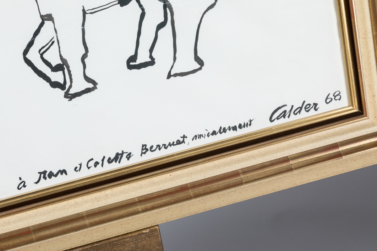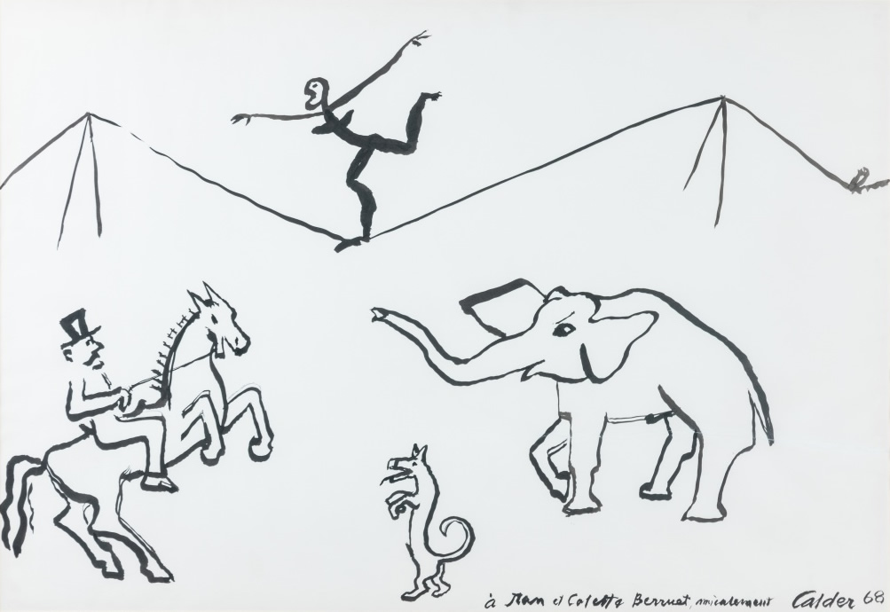 Alexander Calder crée à la fin des années 1920 à Paris son cirque miniature dont il anime les représentations pour ses proches. Le jeune artiste américain prend finalement la mesure de ce qui deviendra l'un des premiers happenings de l'histoire. Improvisation, présence, tension de la pesanteur sur ses mobiles, le cirque de Calder peut être considéré comme son premier chef-d'uvre. Conservé au Whitney Museum de New York, on retrouve son écho et ses éléments d'éléphant, d'acrobate et écuyer et autre chien savant sur notre encre de Chine réalisée 40 ans plus tard.