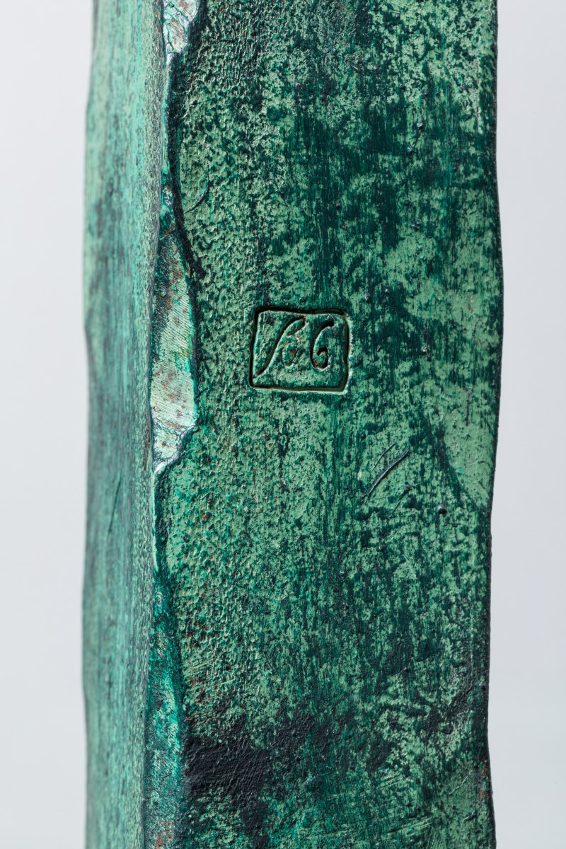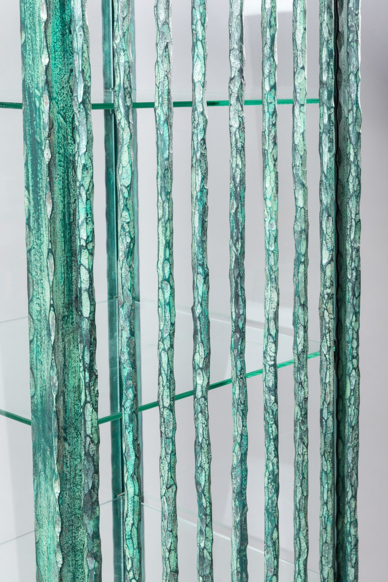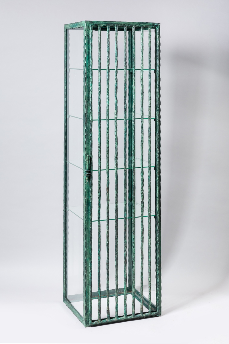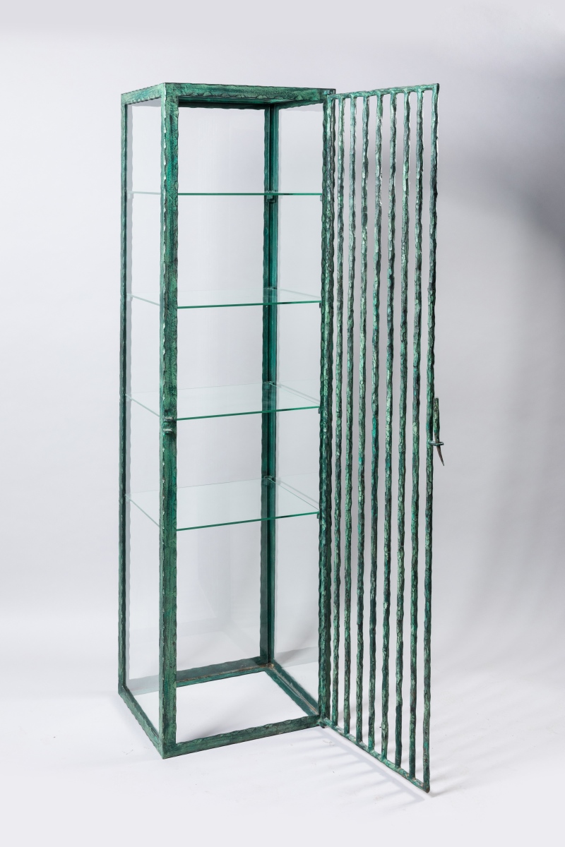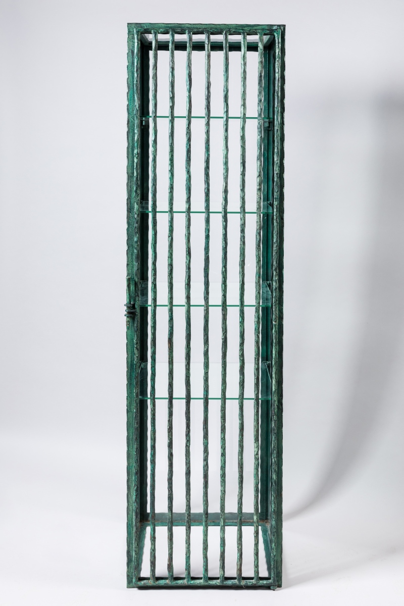 Façade aux barreaux verticaux et structure en fer battu patiné vert antique. Côtés et étagères en verre. Signée "BG".