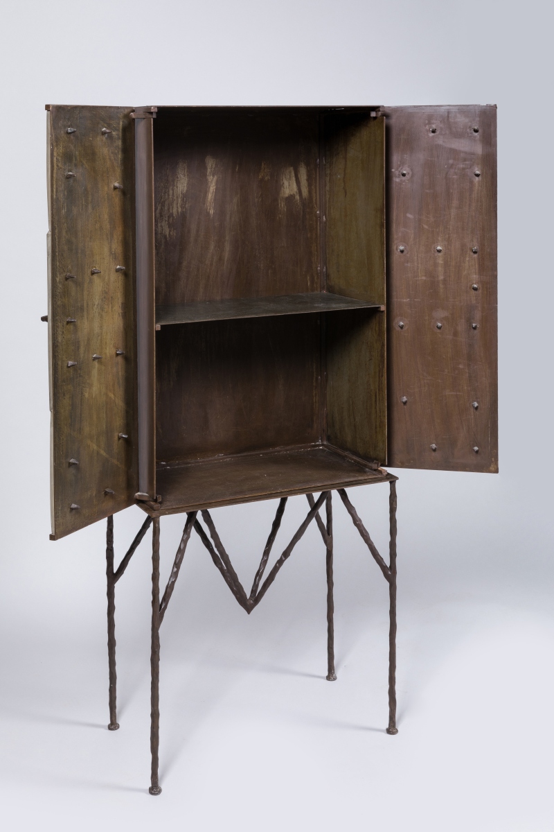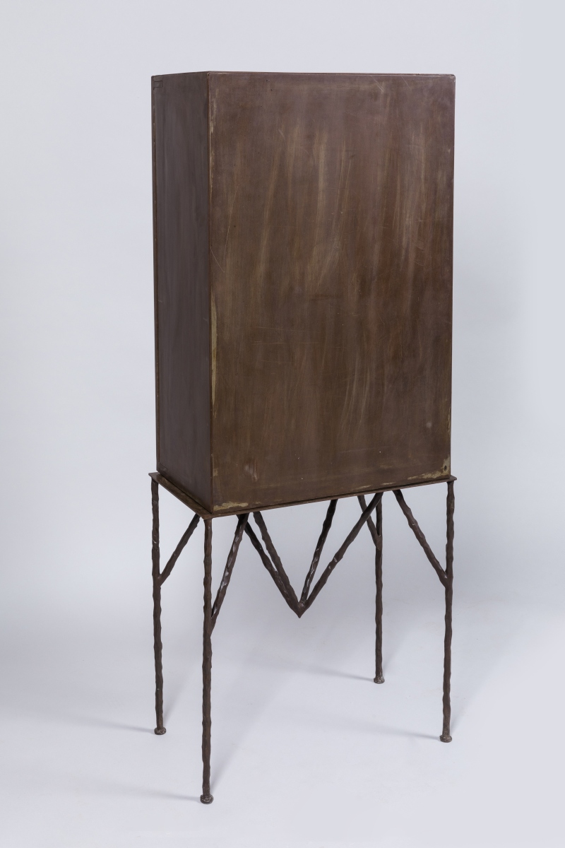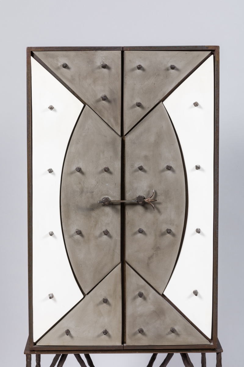 reposant sur un piétement quadripode en fer forgé. Le cabinet parallélépipédique ouvrant par deux vantaux animés de plaques de céramique grise et blanche. Ornementation de pointes hérissées métalliques.