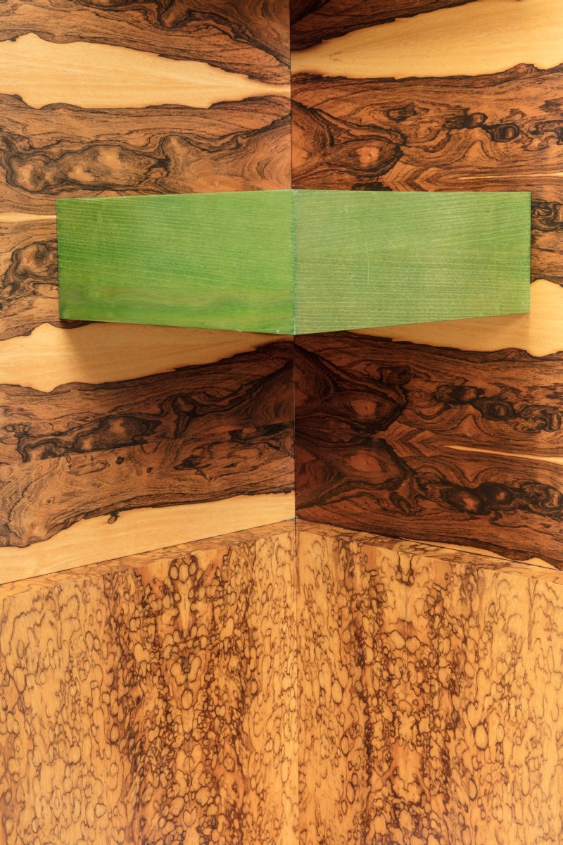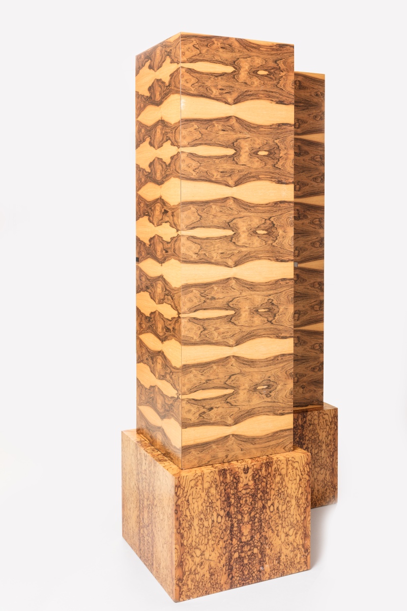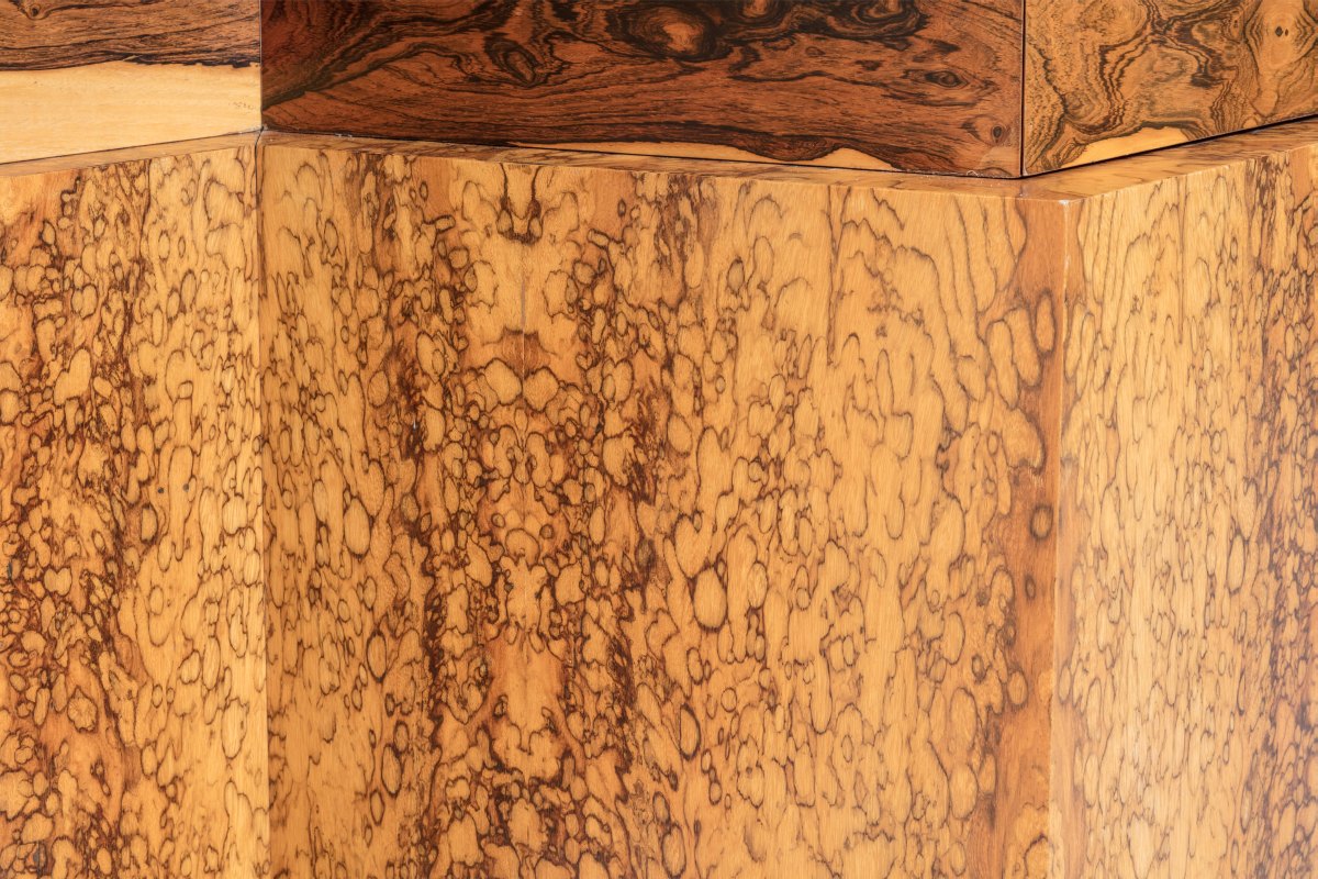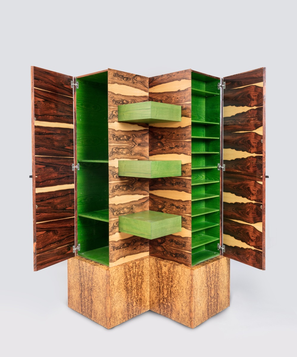constitué de deux colonnes de section carrée en placage de jacaranda toutes faces et réunies par trois étagères en hêtre laqué vert. Elles ouvrent, l'une par une porte, l'autre par deux portes, découvrant un intérieur teinté vert muni d'étagères. Elles reposent sur une haute base débordante plaquée de cerejeira.