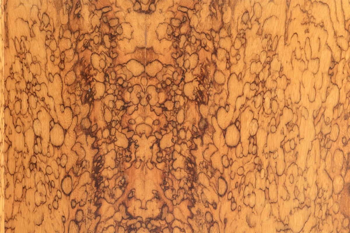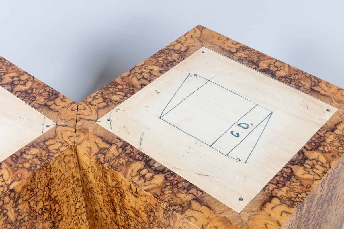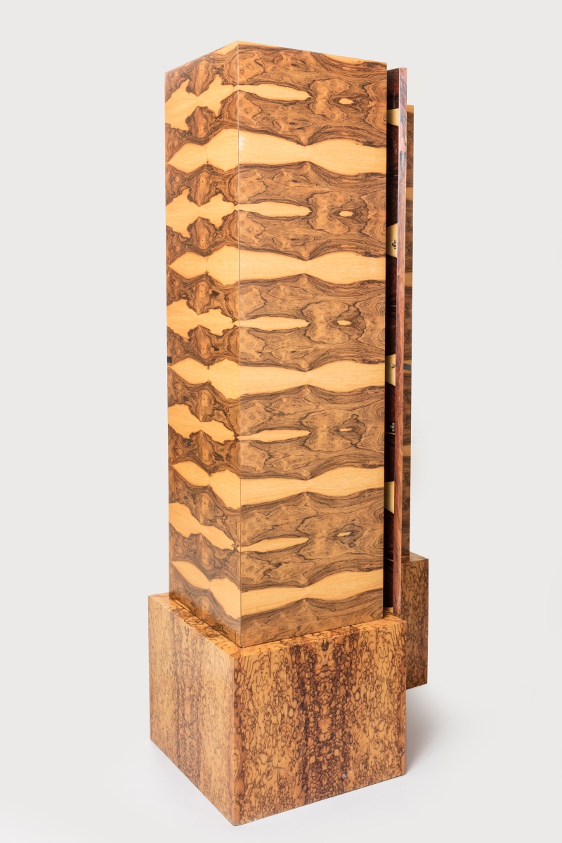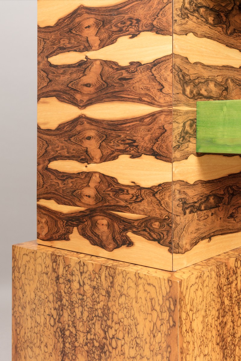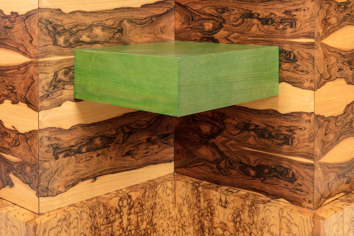 constitué de deux colonnes de section carrée en placage de jacaranda toutes faces et réunies par trois étagères en hêtre laqué vert. Elles ouvrent, l'une par une porte, l'autre par deux portes, découvrant un intérieur teinté vert muni d'étagères. Elles reposent sur une haute base débordante plaquée de cerejeira.
