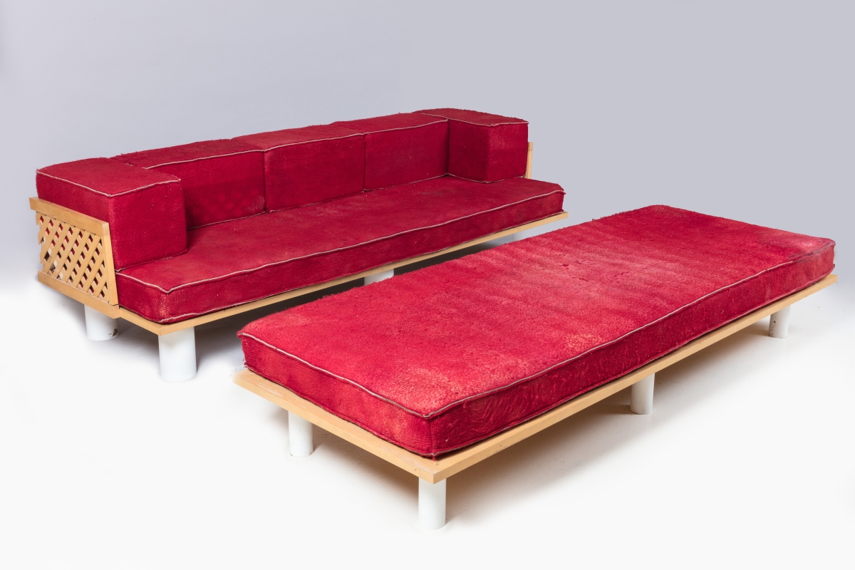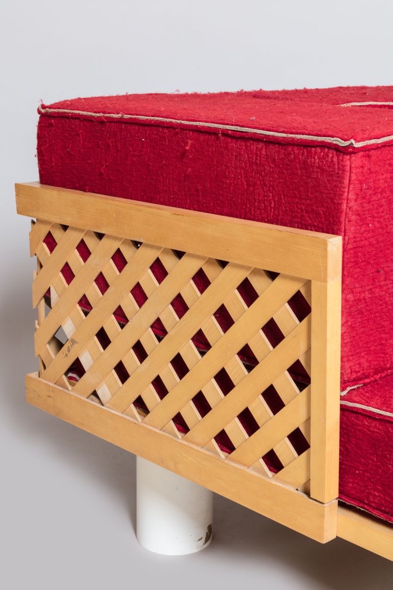 en hêtre reposant sur six pieds cylindriques en métal laqué blanc terminés par des patins. Dossier et accoudoirs agrémentés de cinq coussins cubiques recouverts de leur tissu d'origine en coton duveteux rouge cerise.