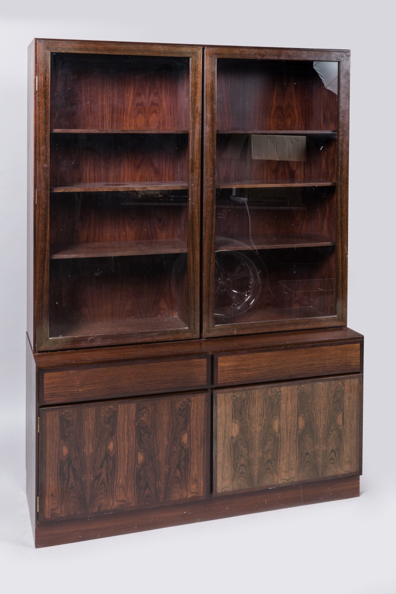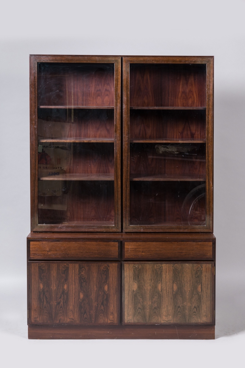 en palissandre. Elle ouvre par deux portes vitrées dans sa partie supérieure et révèle quatre étagères de chaque côté, et ouvre dans sa partie inférieure par deux vantaux et deux tiroirs.
