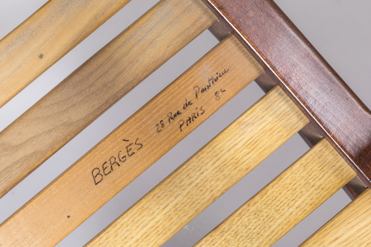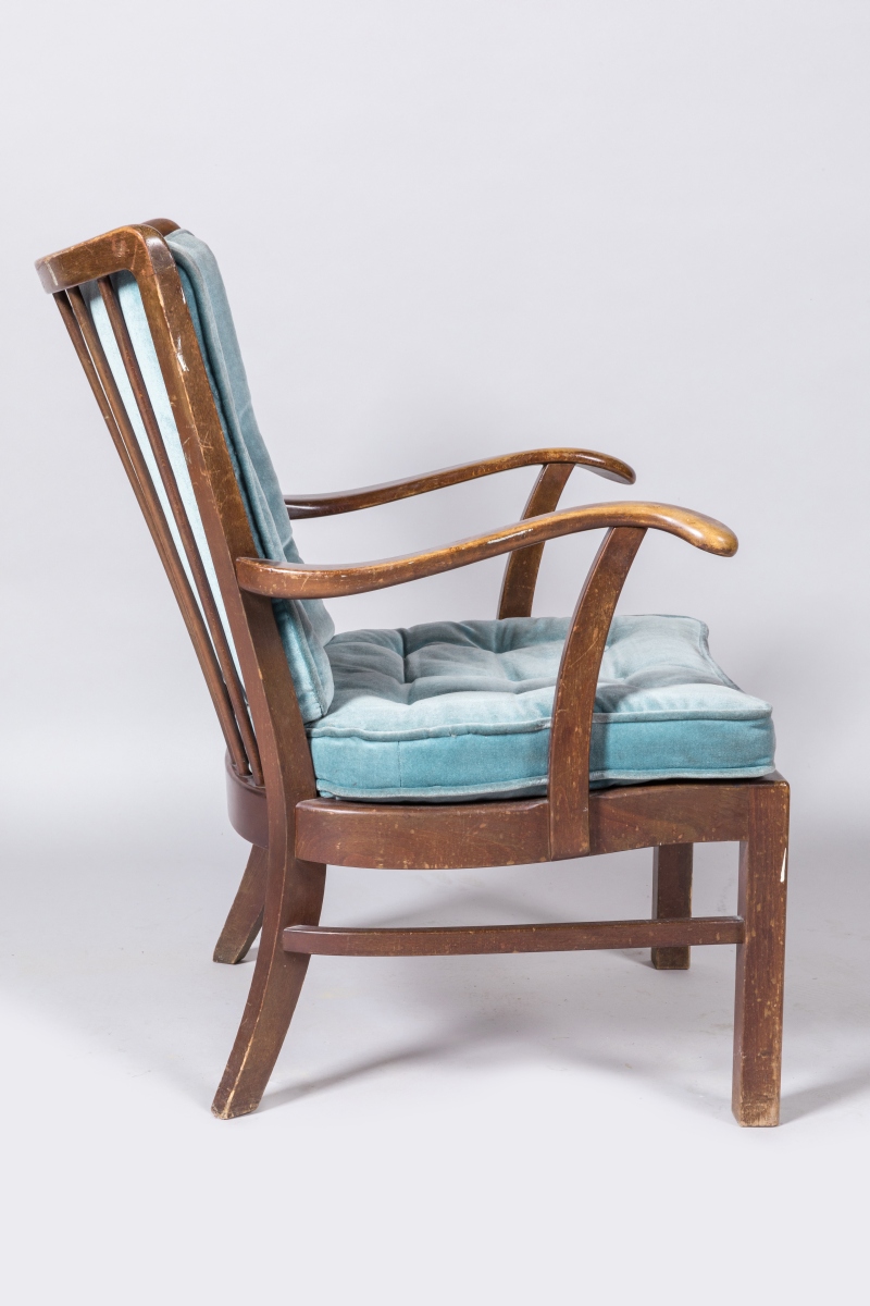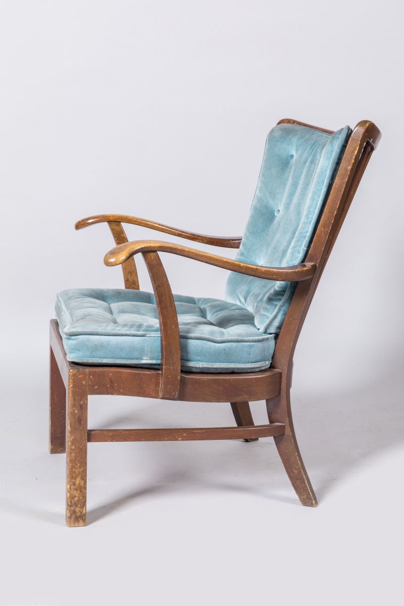 Garniture en velours bleu. Étiquette manuscrite du fabricant sur le châssis.