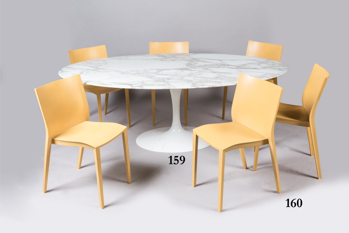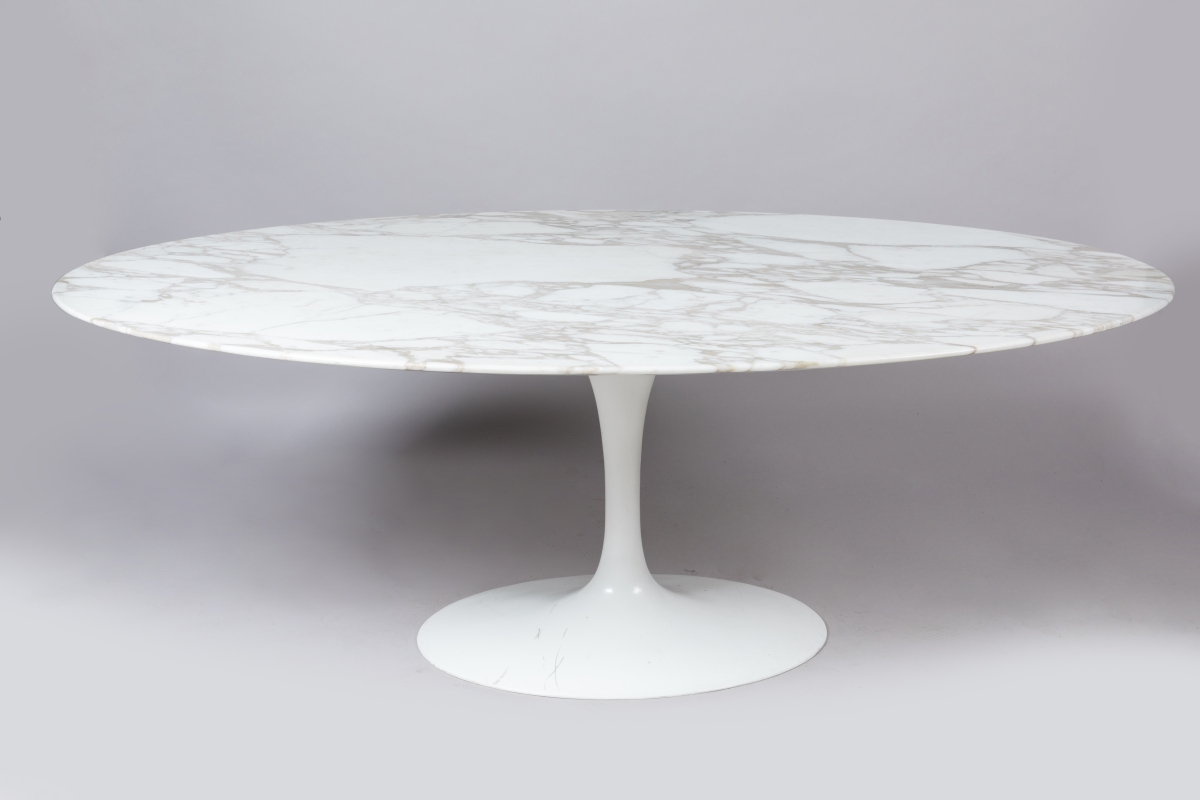de forme ovale, le plateau de marbre blanc veiné de gris, piètement tulipe en fonte d'aluminium laqué blanc.
