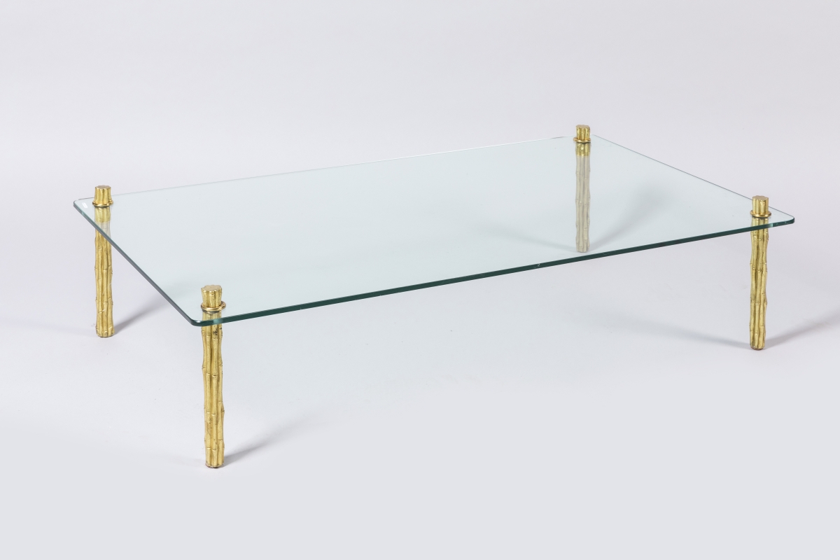le plateau en verre reposant sur quatre pieds façon fagots de bambous en métal doré.