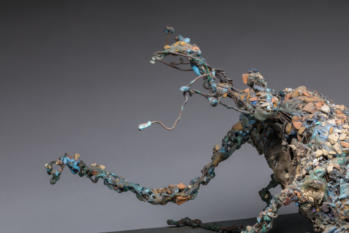 en grillage, plastique fondu, incrustations diverses, signée sur le socle.