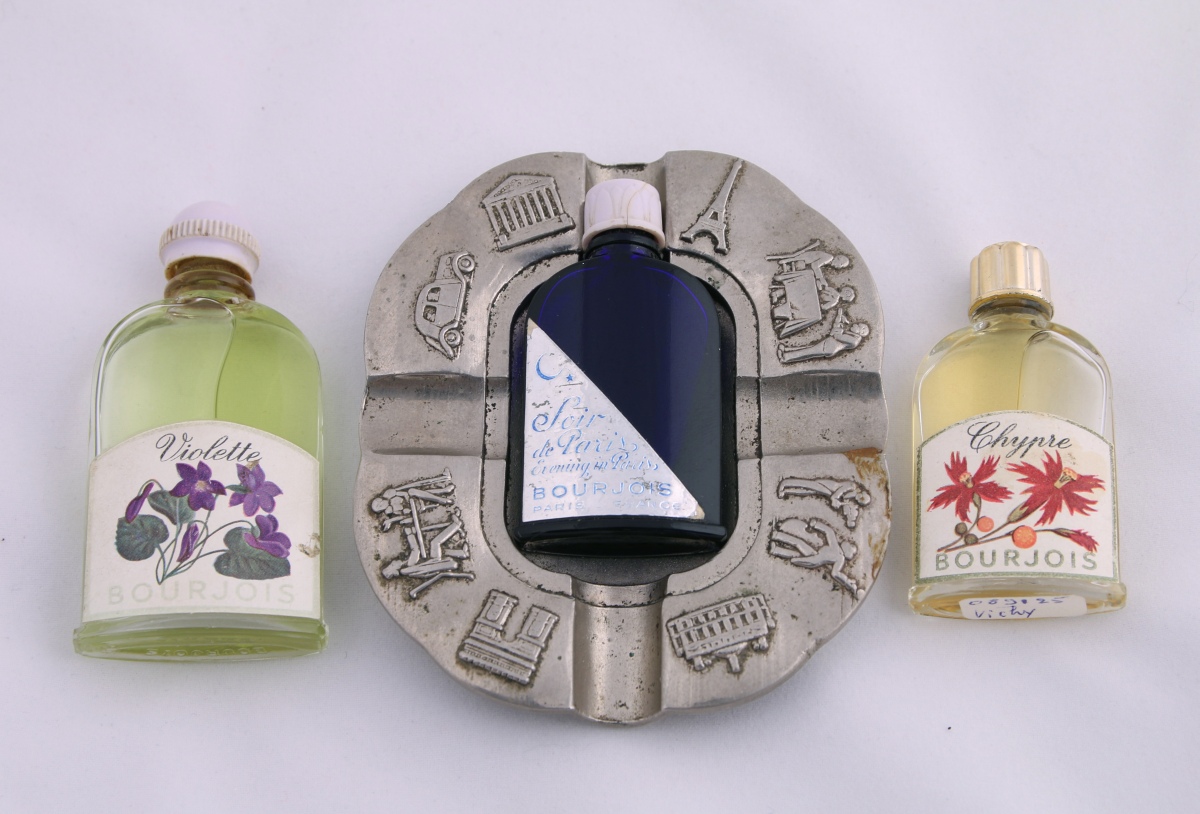 Lot comprenant deux flacons en verre incolore modèles "borne" avec capsule, parfums "Chypre" et "Violette", et un flacon "Soir de Paris" modèle "borne" avec capsule en verre bleu nuit avec étiquette argent présenté dans un mini cendrier en résine argent moulé décoré des monuments de Paris.