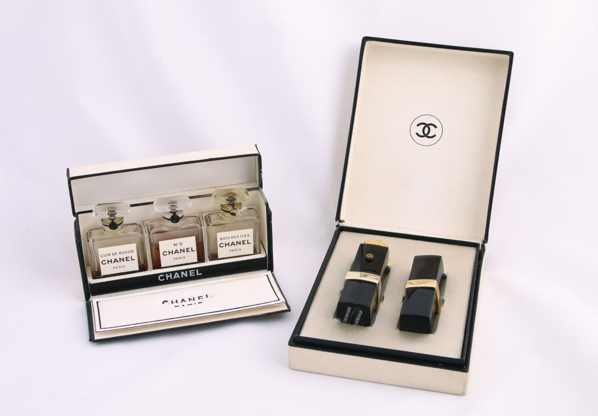 Joint : un coffret de la maison contenant un flacon-vaporisateur et un étui de rouge à lèvres. (PdO).